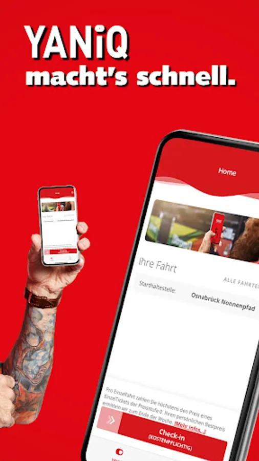 YANiQ makes it possible. The check-in | Be-out app from Stadtwerke Osnabrück AG guarantees you always the best BusTicket in the Osnabrück urban area (tariff zone 100, Osnabrück / Belm).