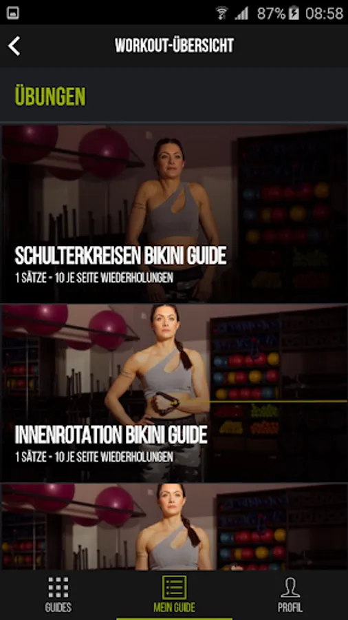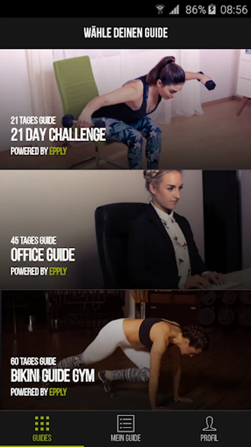 Derzeit kannst du aus unseren drei Fitnessprogrammen Bikini Guide, Office Guide oder der 21 Day Challenge auswählen.