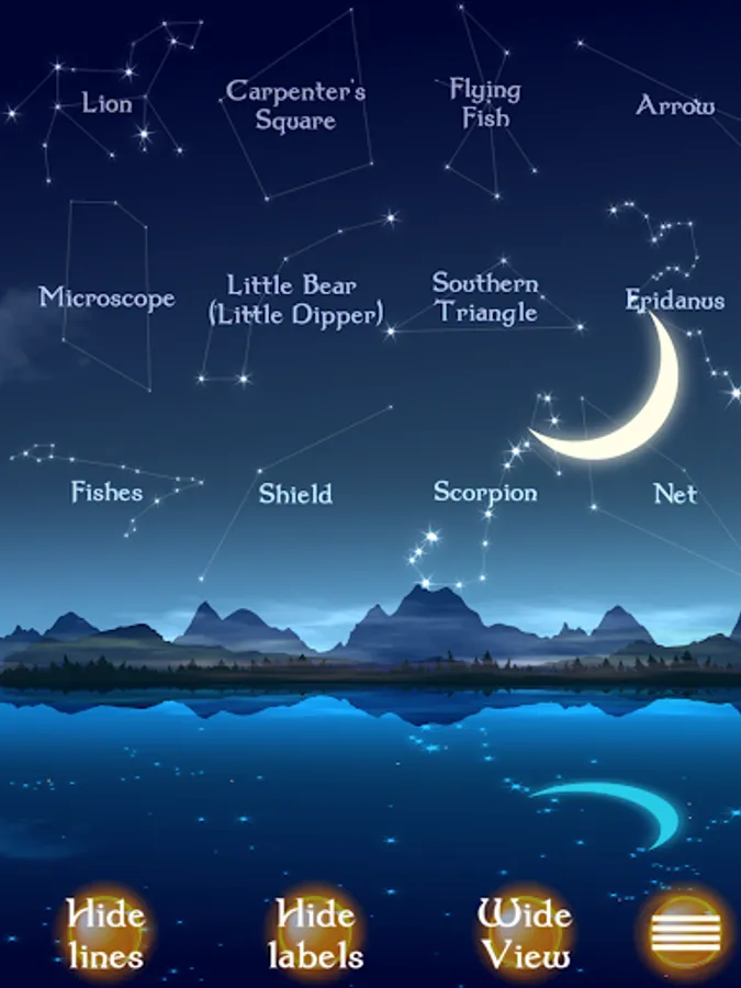 * Enjoy the view of your nightly sky! For all your restored constellations, you can show their latin or english names as well as the constellation lines.