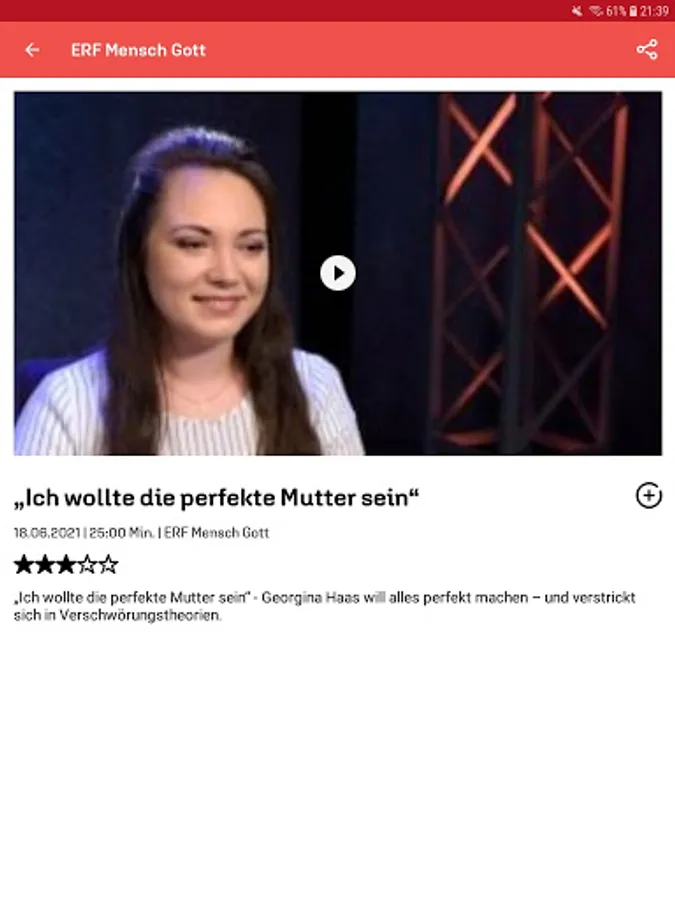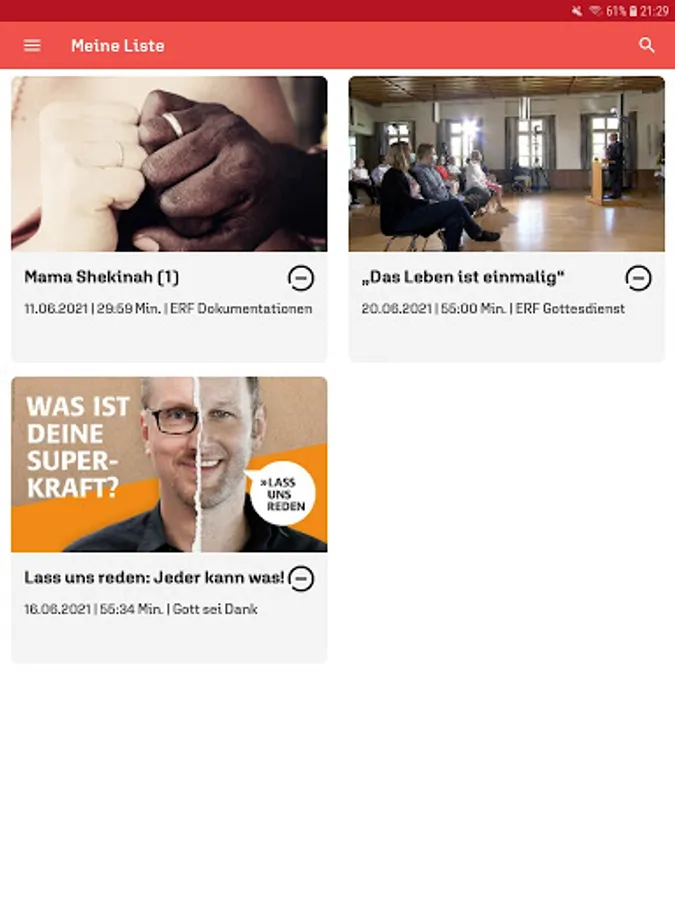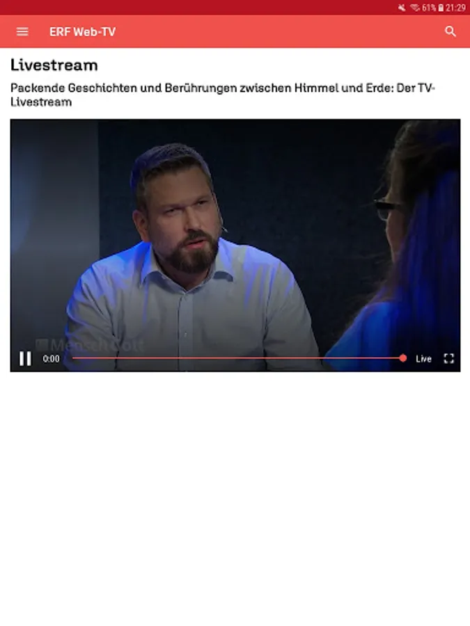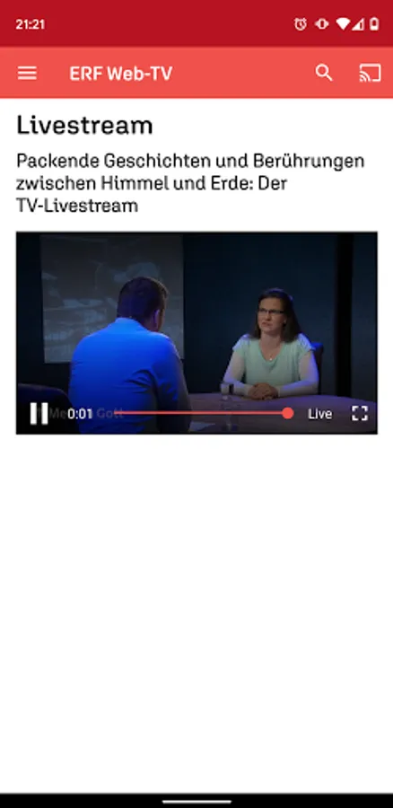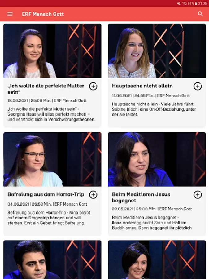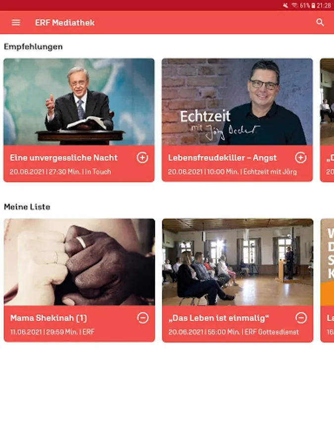 With the free app from the ERF media library, you can conveniently access ERF programs at any time. Current issues of the popular series "ERF Mensch Gott", "ERF Thank God" are available on demand, as are the ERF church services, "ICF - experience the church anew" and many other programs.