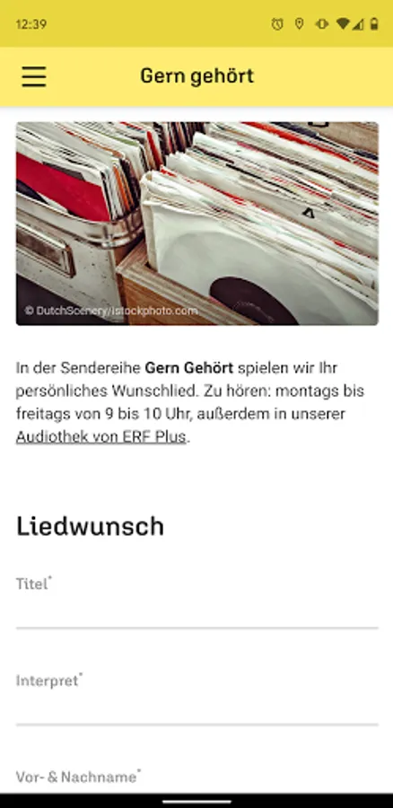 With the ERF Plus app you get a lot of information about the songs: title, artist, cover, 30-second sample, links to buy, push notifications to stay informed about current events and promotions. You can also send us messages directly to the studio and request songs. We want our listeners to know God and have him change their lives.