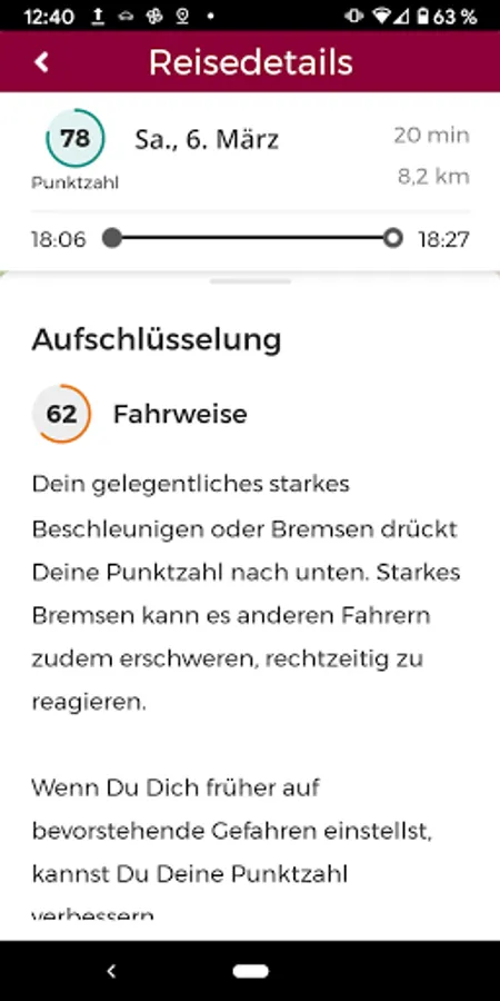 The ERGO SafeDrive app runs in the background and is automatically activated at the start of the journey when you start a journey. The achievable score for a single trip is determined by: