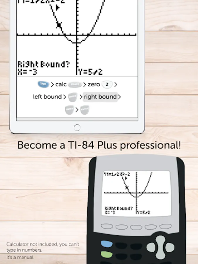 • Every topic shows a detailed instruction through screenshots of the original graphing calculator TI-84 Plus which explain how to use the calculator. You only have to swipe right to get the next screenshot which looks similar to your calculator display!