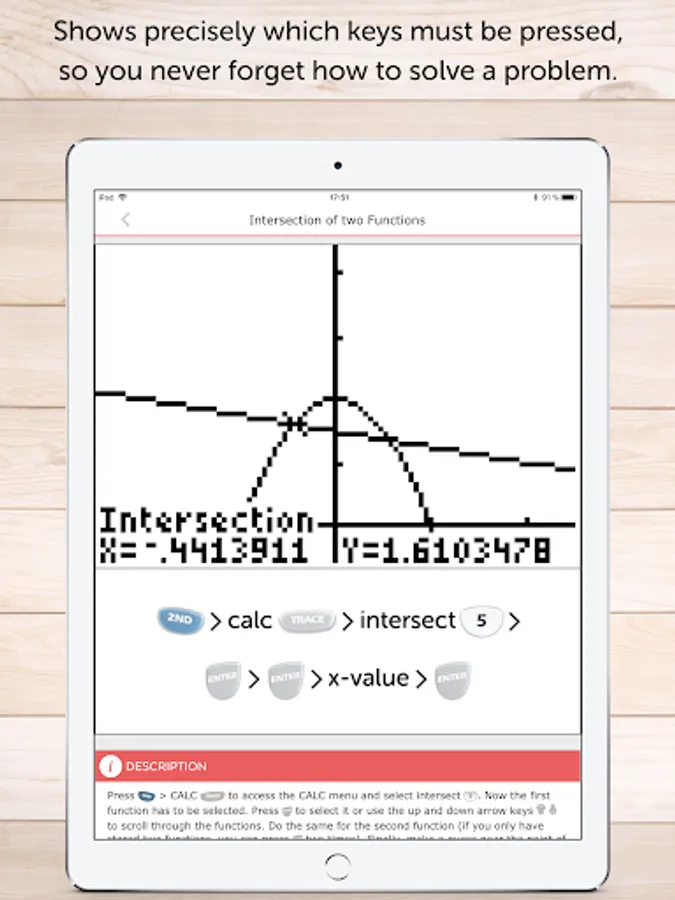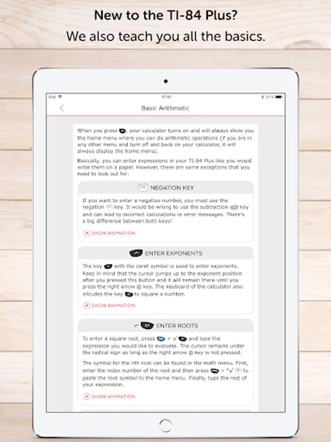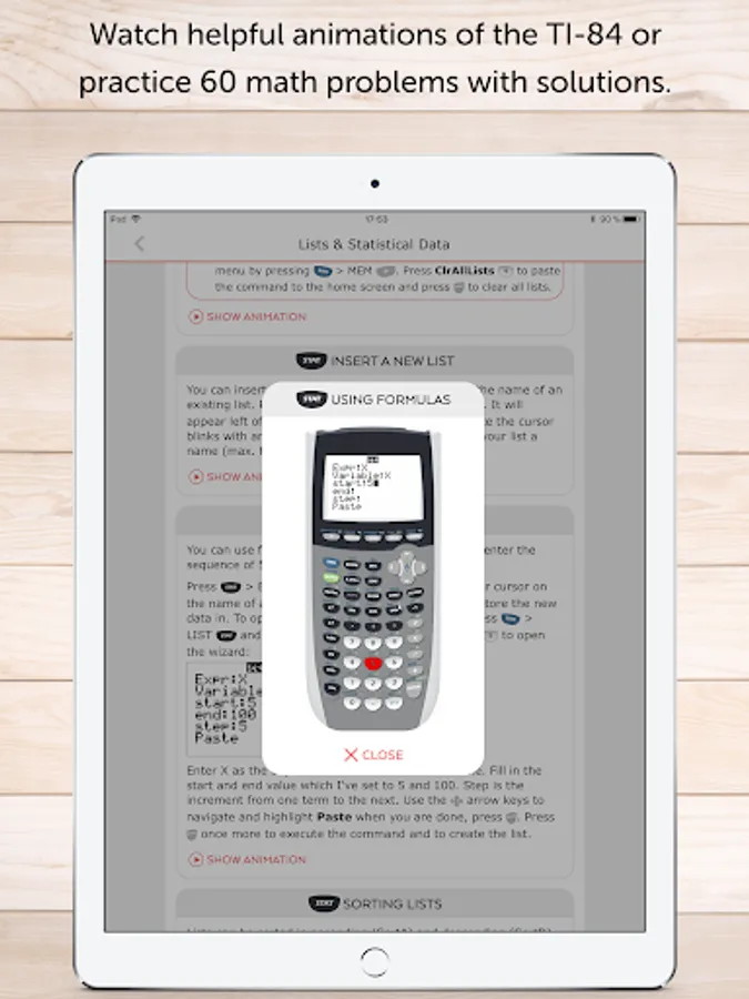 • You can swipe through screenshots of the original graphing calculator which show every step you have to do (220 screenshots in total) or watch small animations to see how it works on the TI-84!