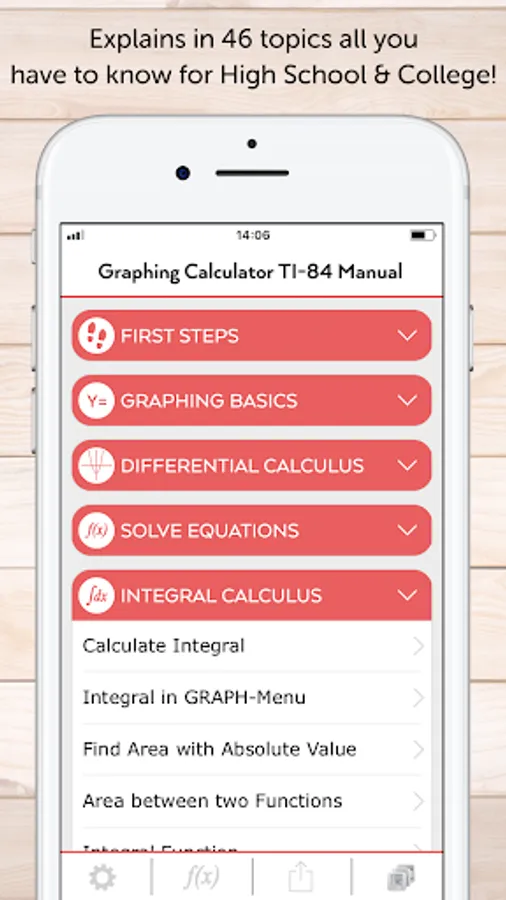 • The app shows the exact key press sequence for 46 topics. It covers the chapter:s First Steps, Graphing Basics, Differential Calculus, Solve Equations, Integral Calculus, Matrices and Statistics & Probability.