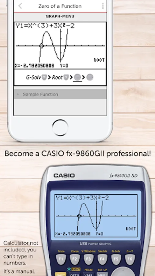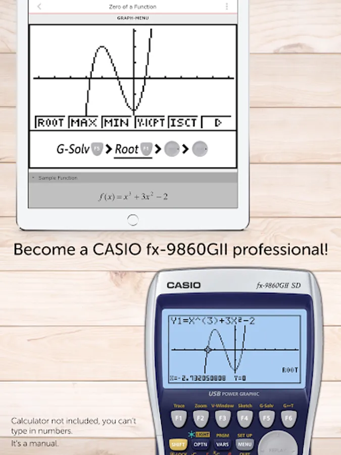 •This manual (the app is no calculator) shows all important functions of the graphing calculator CASIO fx-9860Gll, which are very useful for high school (also suited for fx-9860G and CFX-9850G).