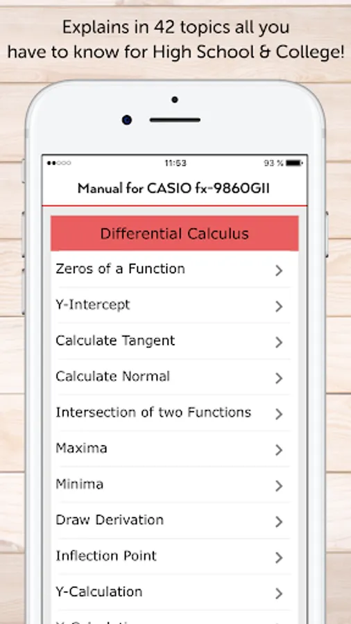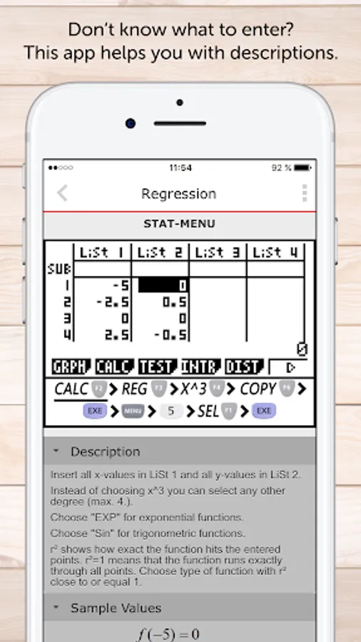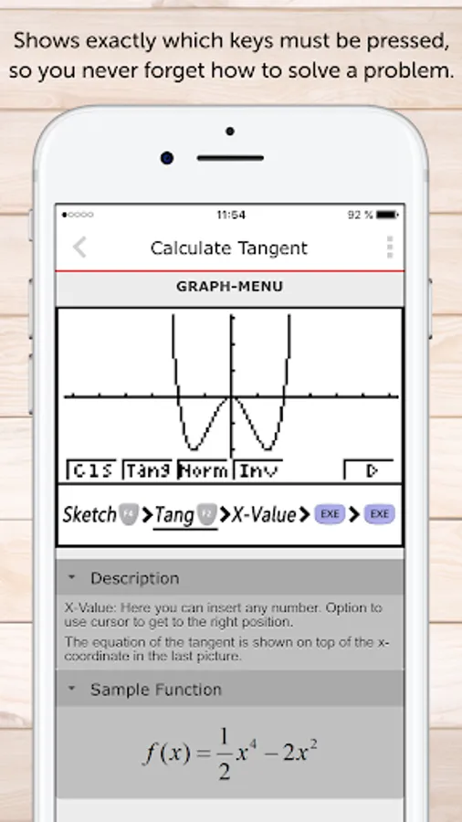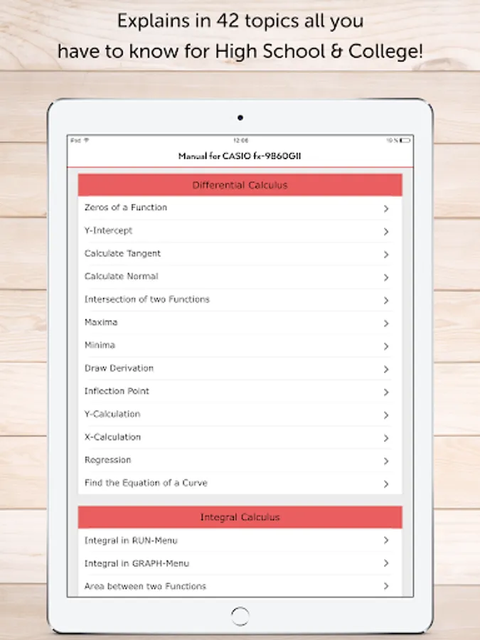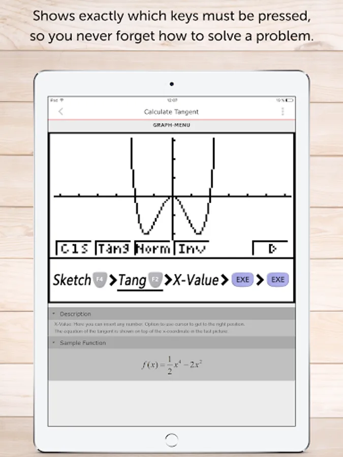 •The app shows exactly which buttons you have to press on your calculator for every topic.