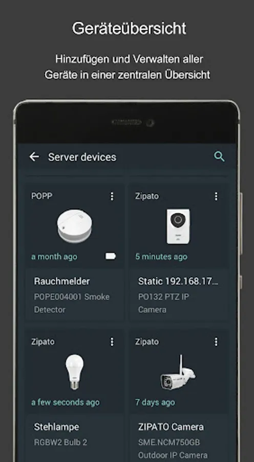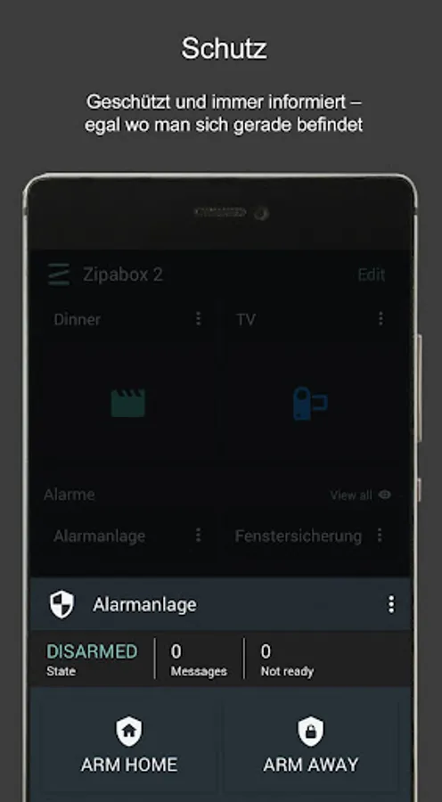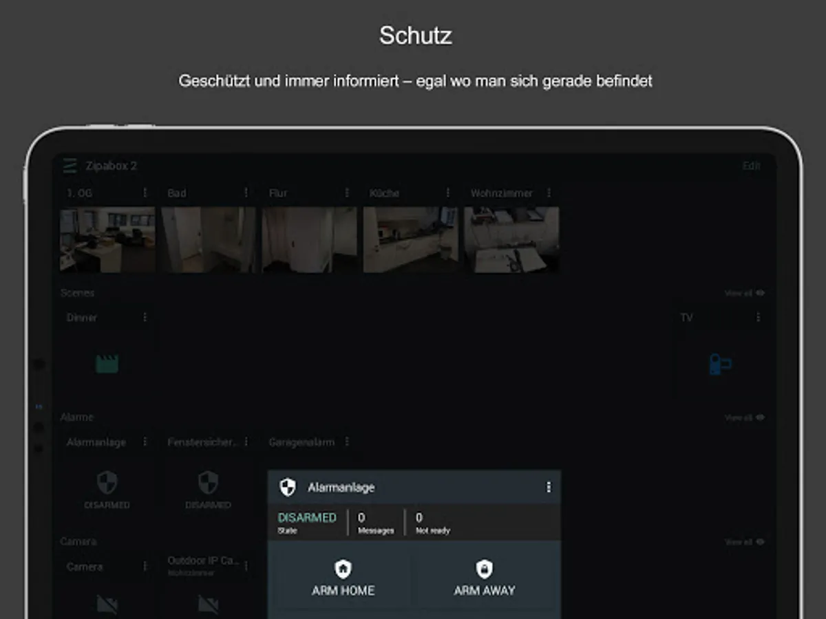 - Protection of individual areas with motion detectors, door and window contacts, smoke detectors and cameras