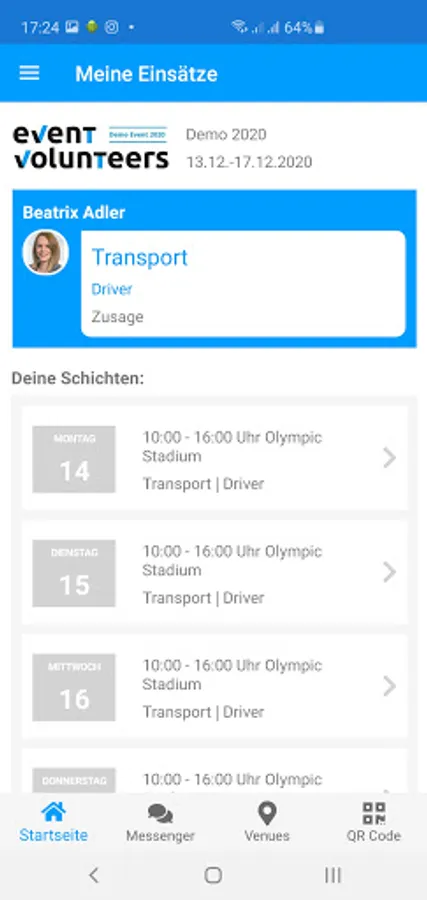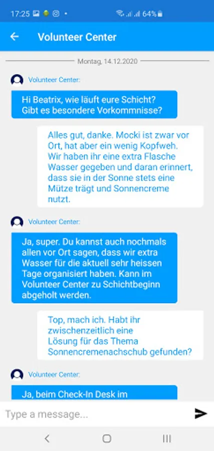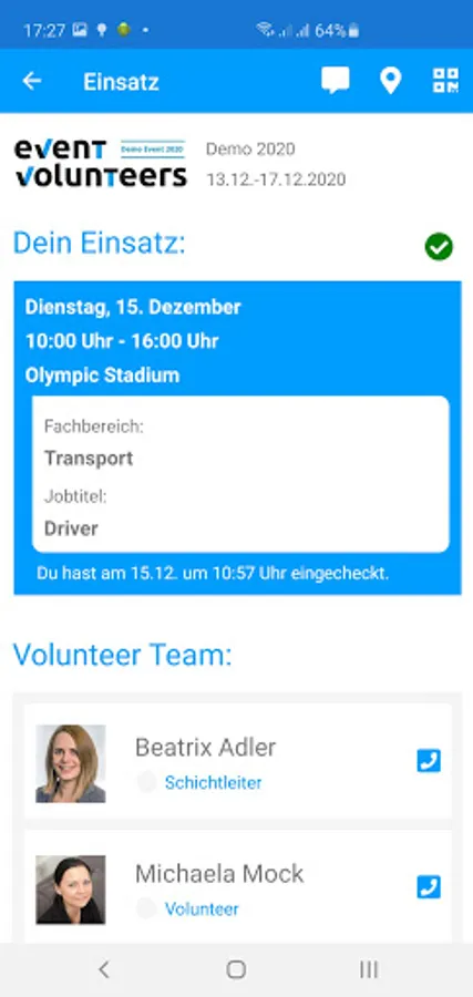 In the Eventvolunteers app you can call up your current schedule, check in for your shift or communicate with the volunteer center or the other volunteers on your shift via the integrated messenger.
