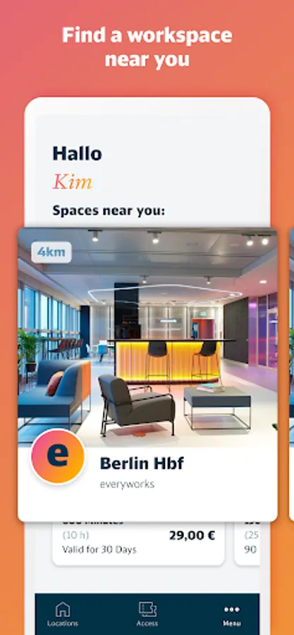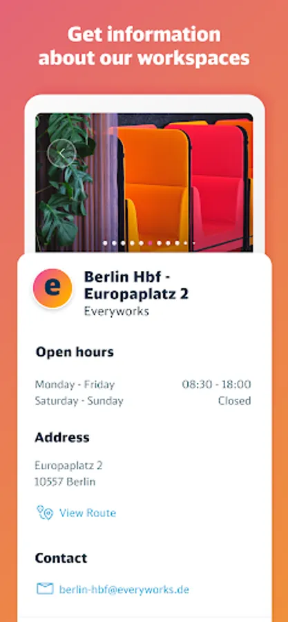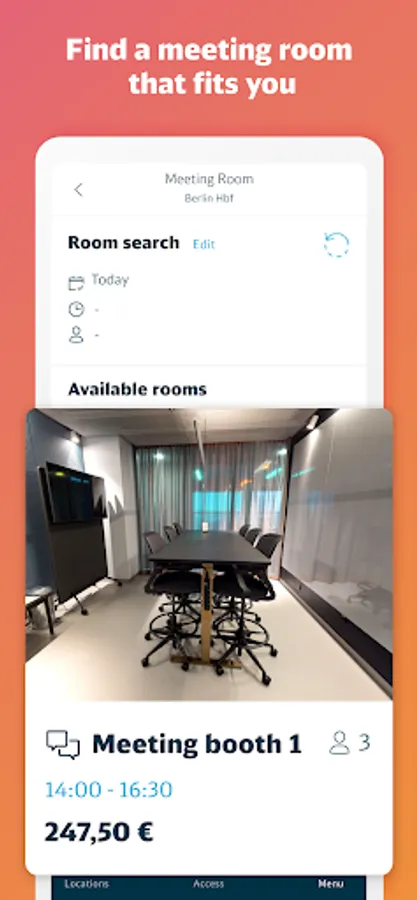 • Meeting Room: The most central meeting place in the city. Simply select the ideal meeting room via the app, book it and add participants. Receive the access pass to the meeting and use the app for convenient check-in/out.