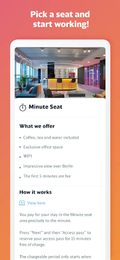• Minute Seats: Your temporary professional workplace. Simply check in via the app, choose a seat and be productive. Billing is simple and to the minute after check-out.