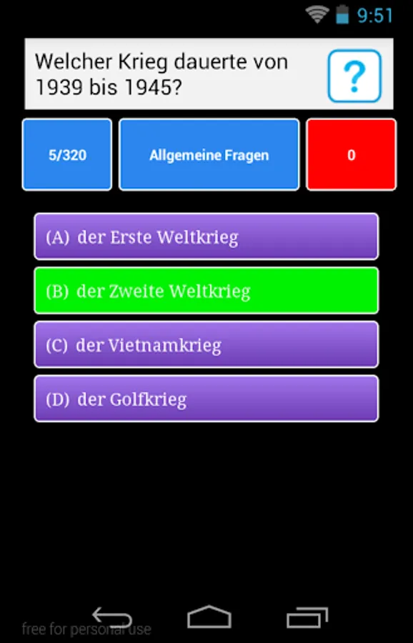 The personal learning success can be controlled any time . It matters that you have not answered correctly are marked in red , the questions have even answered korrrekt to three times orange and questions you have answered at least four times correctly displayed in green.