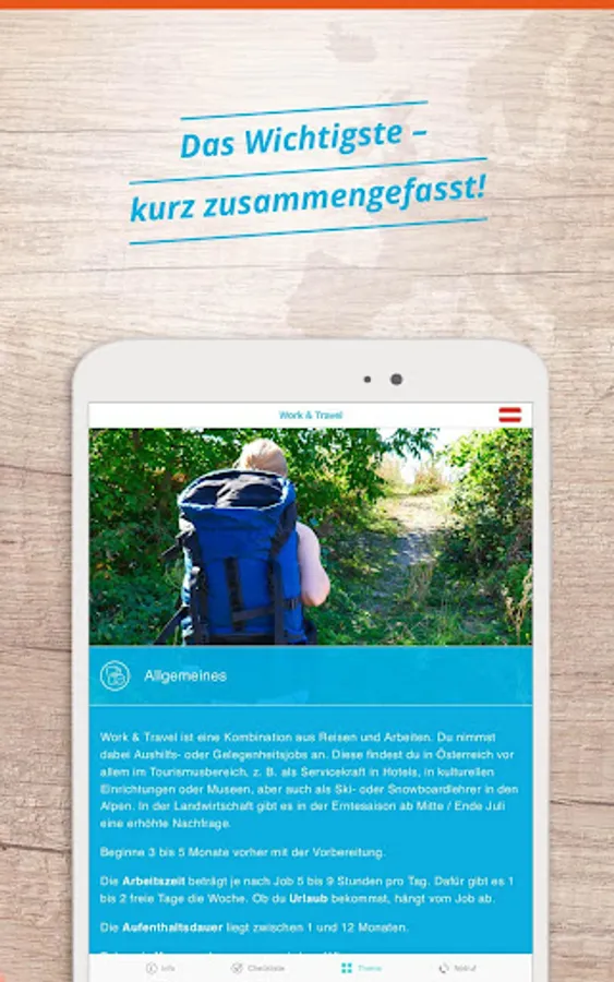 Do you want to travel to other European countries for a short or longer period of time? This app, specially designed for young people, will help you to prepare. It contains many useful tips and contacts - be it e.g. B. for studying abroad, an au pair stay, looking for a job or just for a weekend trip with friends.