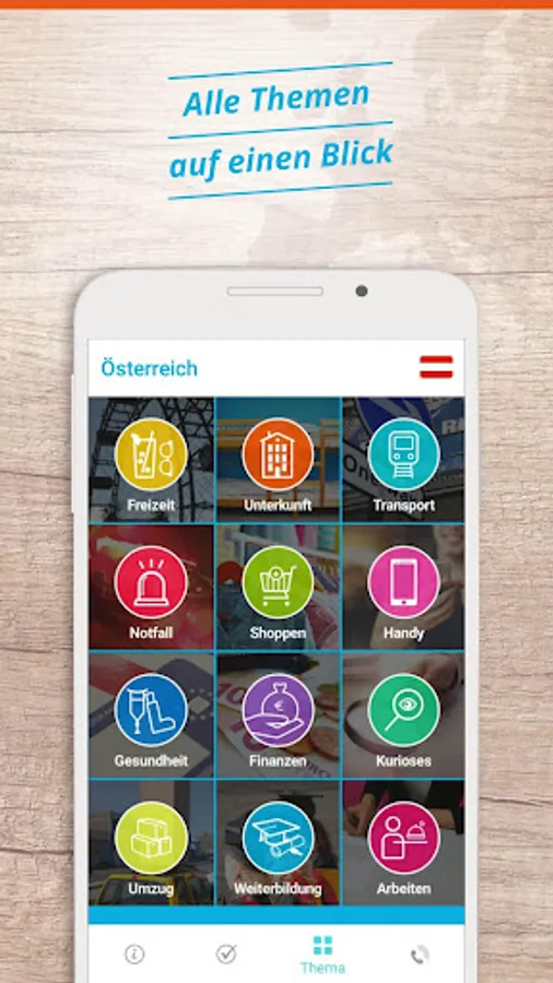 The categories: leisure, accommodation, transport, emergencies, shopping, mobile phone, health, finances, relocation, further education, work, curiosities.