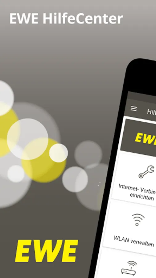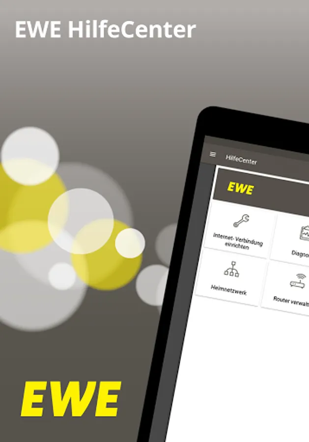 With the EWE Help Center you can easily set up and manage your Internet connection and WLAN at home. The free app offers you a wide variety of useful functions relating to your home network, which are arranged as clear tiles in the main menu of the app.