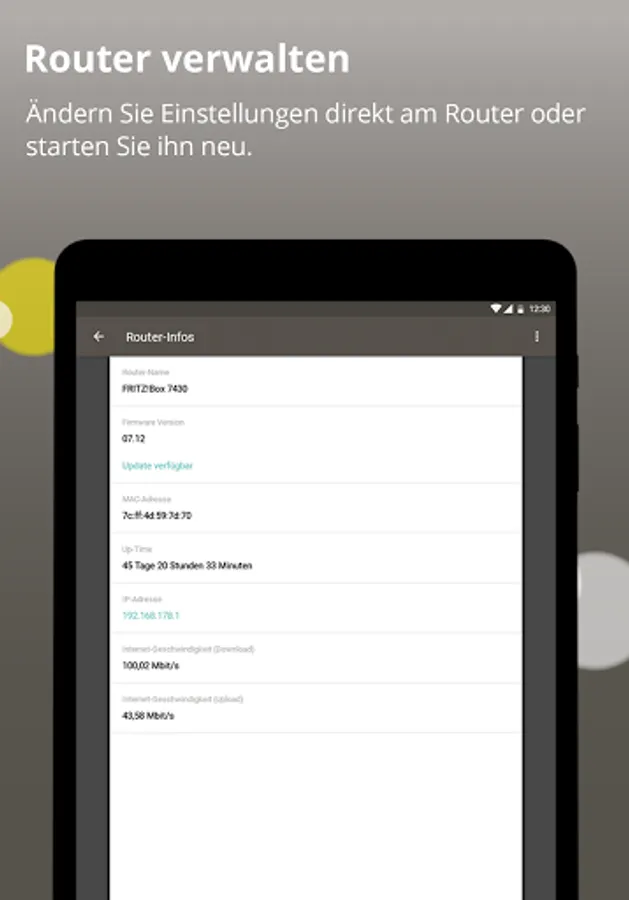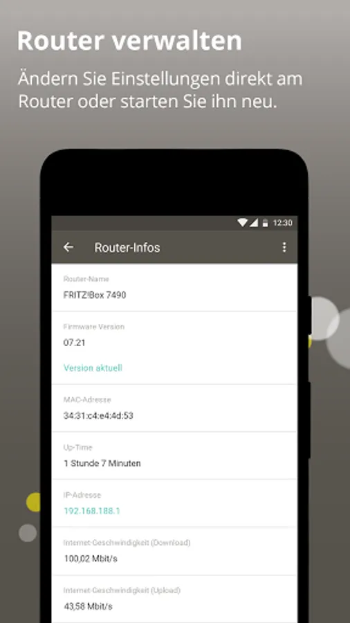 With "Manage router" you can view all important information about your router directly in the app. There is also an automatic restart function for problems with the router.