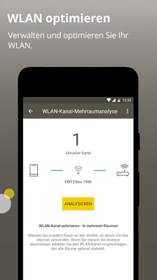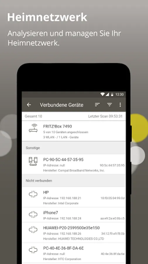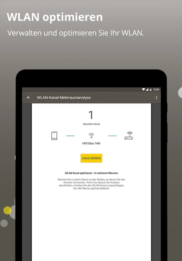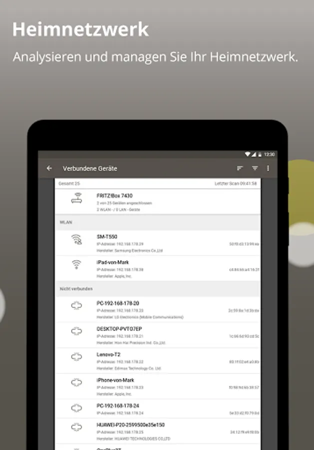 The "Home network" tile leads you to comprehensive analysis tools with which you can e.g. Measure the strength of your WiFi signal or position a WiFi repeater ideally. You can also measure your WiFi speed in your home network and receive a list of all available WiFi devices in the area.