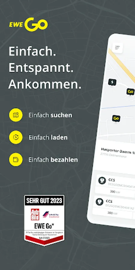 Simply arrive relaxed. With EWE Go, you can find the right one for you from a charging network of around 400,000 charging points for electric cars to reliably charge your e-car. Our charging network includes more than 400 High Power Chargers with up to 300 kW charging power.