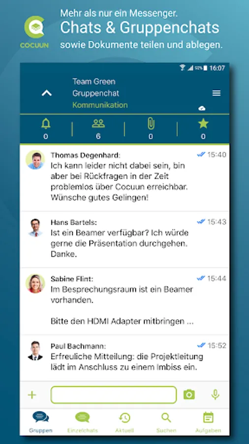 People who want to work together easily and efficiently exchange information and documents via Cocuun, manage projects, plans or orders, make appointments, organize meetings or events or discuss new ideas in groups or in confidential chats. Anytime, anywhere - and from any device.