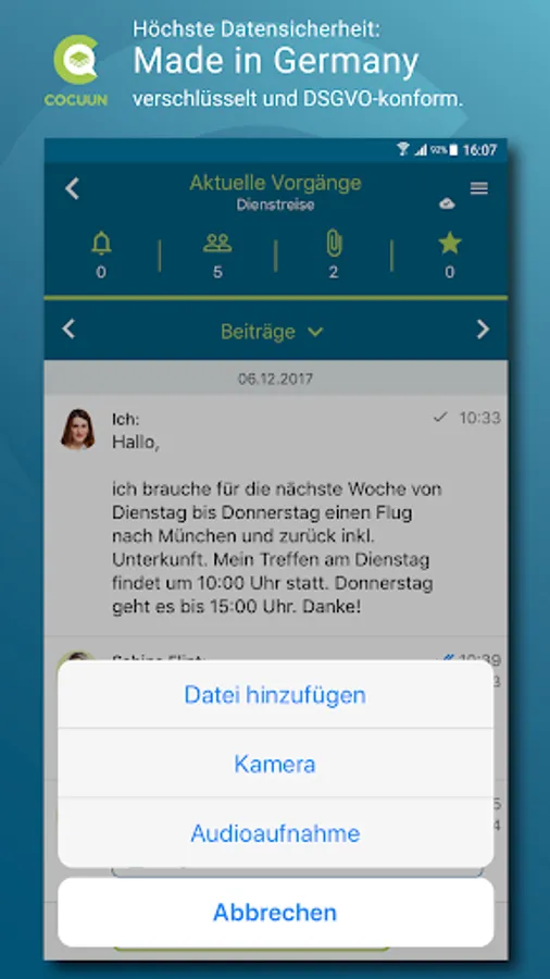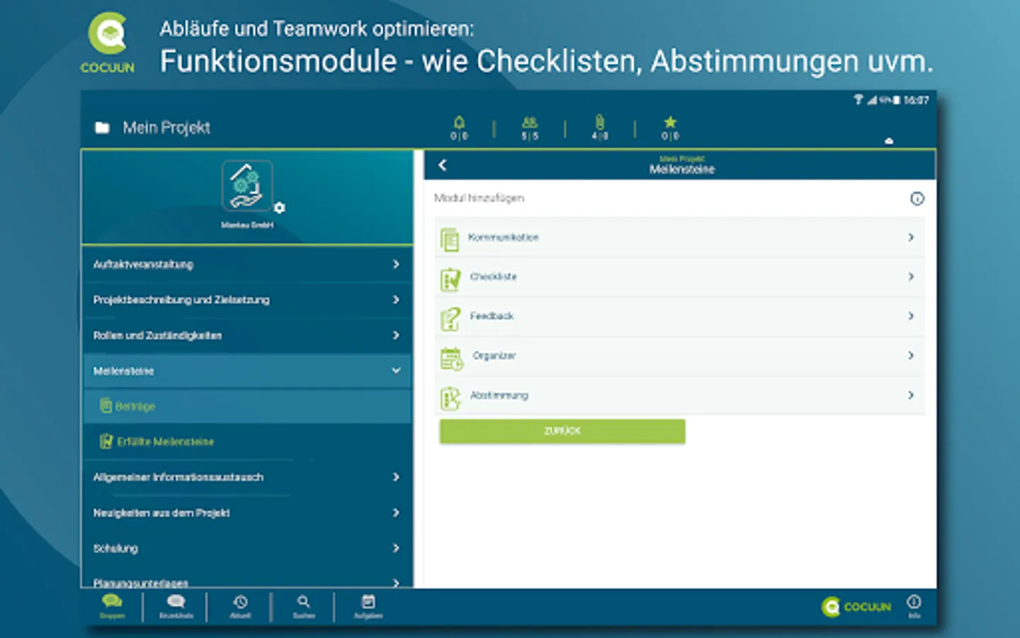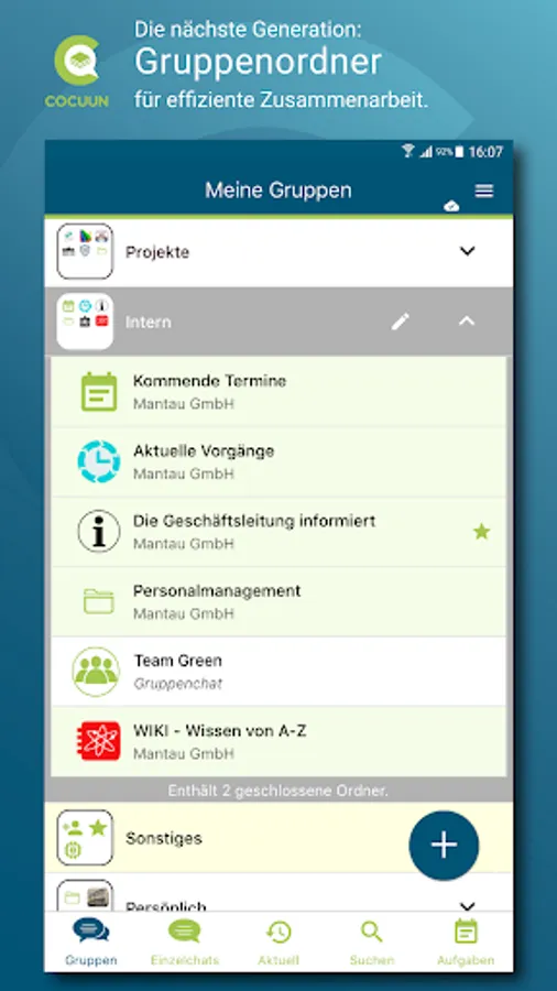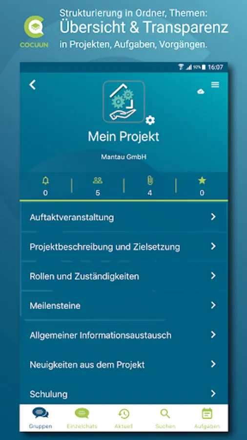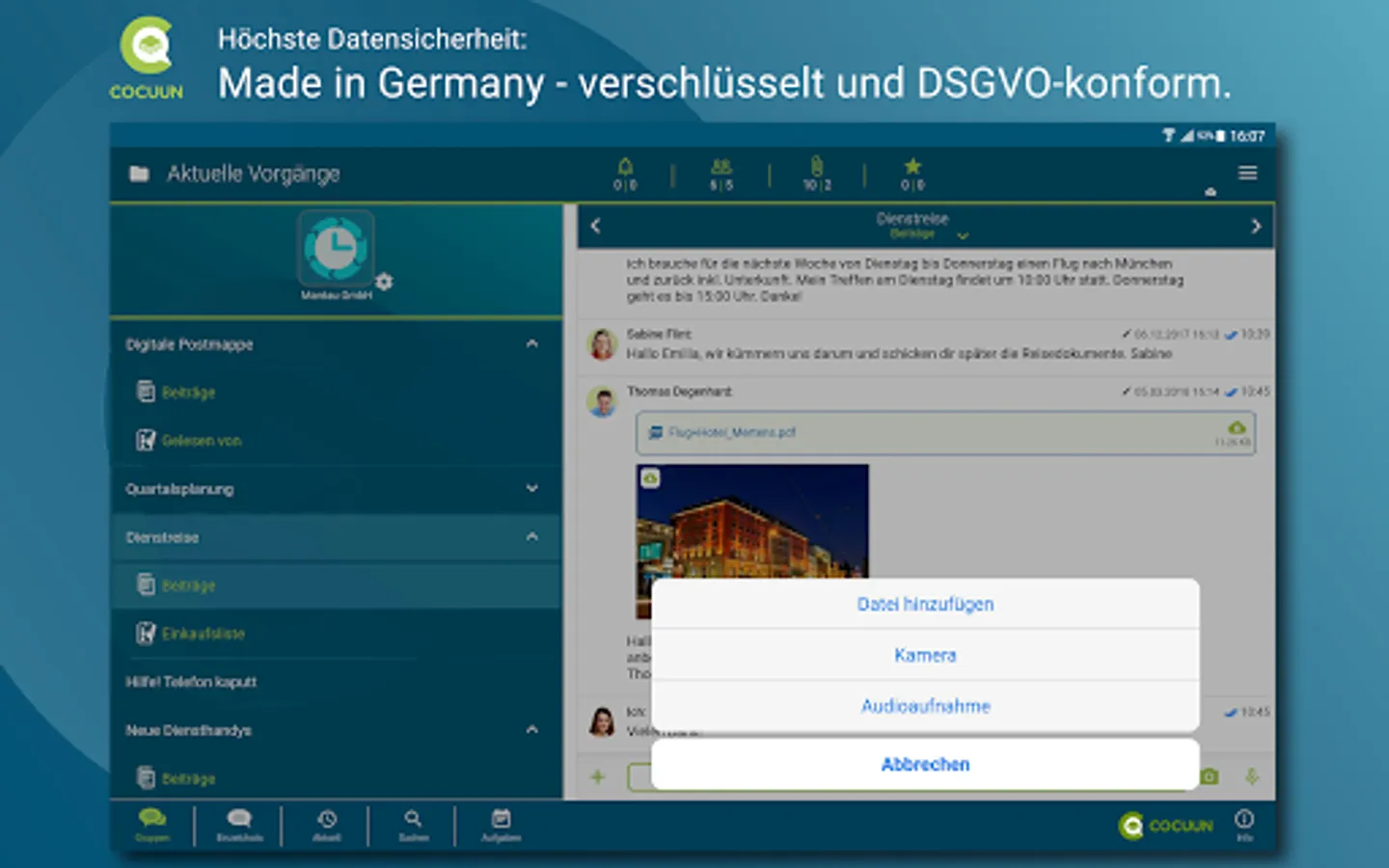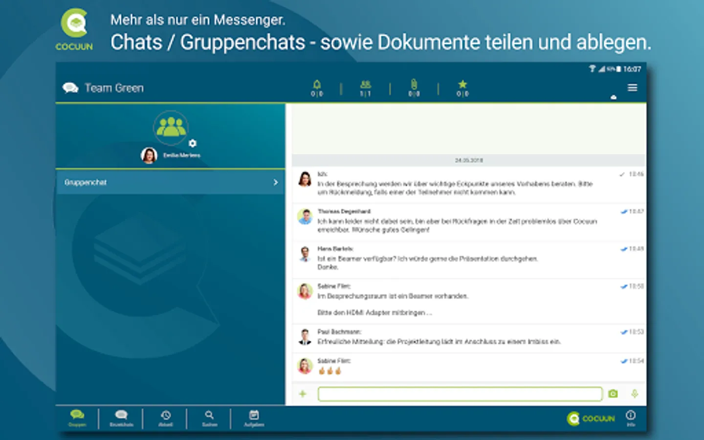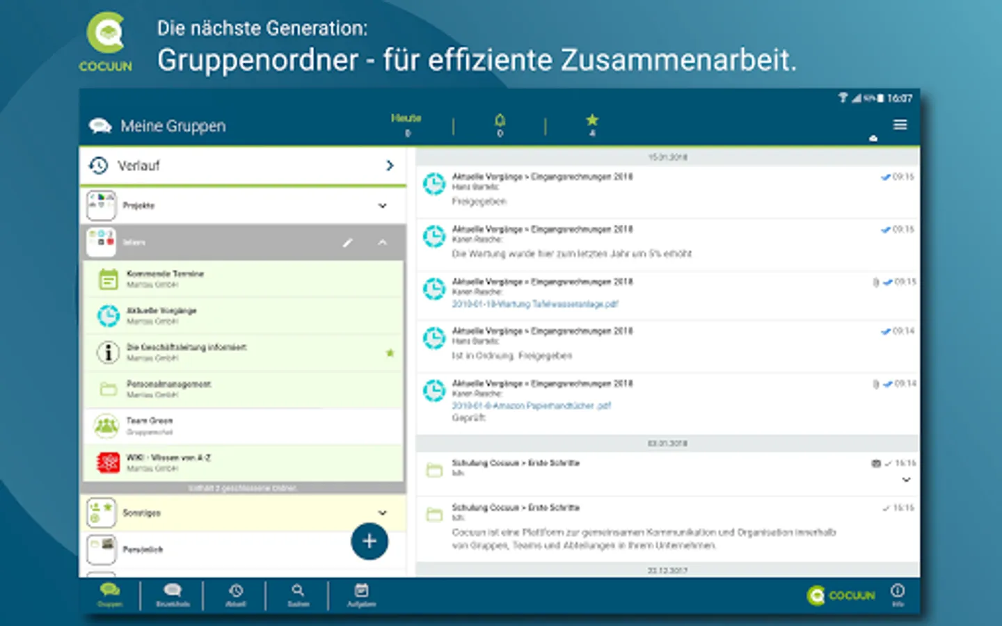 Cocuun is the German collaboration tool for organisations, clubs, educational institutions/schools, initiatives, companies and private groups. Cocuun is a secure messenger, collaboration tool, teamwork app, cloud storage, social intranet and simple project management tool all in one. Including video conference function for two and for groups!