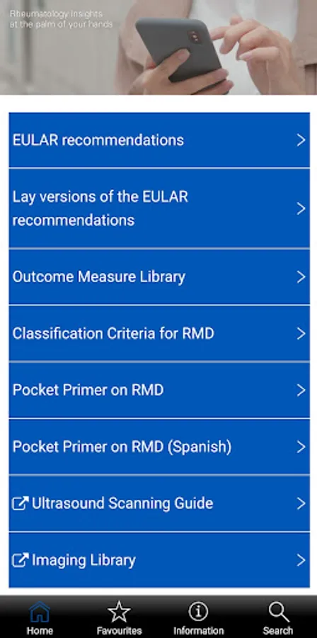 Welcome to the official EULAR App. EULAR provides you a most comprehensive tool to provide information and guidelines on rheumatic and muskuloskeletal diseases for use by rheumatologists, other medical doctors and health professionals in rheumatology as support in your everyday work.