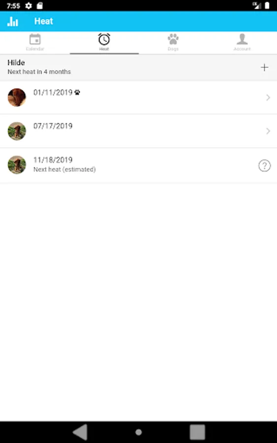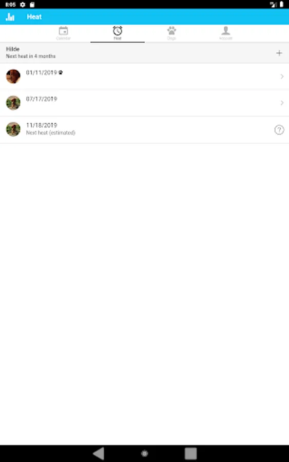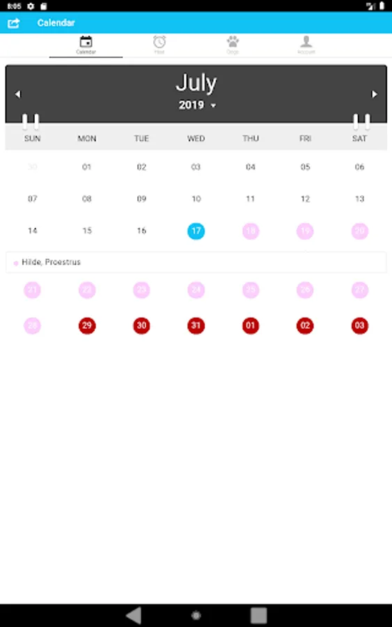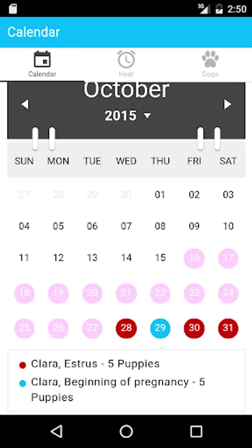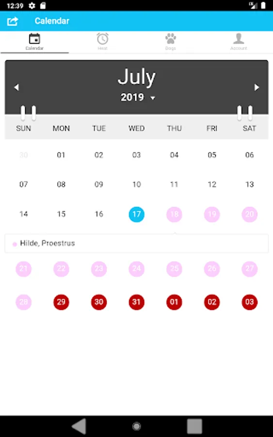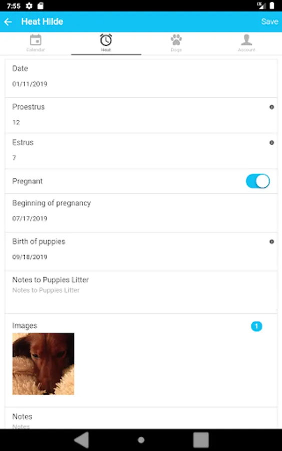 The "Puppy Planner" is easy to use and gives you a quick overview of the heat cycle of your dog. You simply enter the beginning and end dates of her period into your "Puppy Planner", and the subsequent bleeding periods will be automatically displayed from cycle to cycle. Small icons indicate the proestrus, estrus, and metestrus of the dog after you have independently entered this information the first time. The best probable time for successful coverage is also displayed.