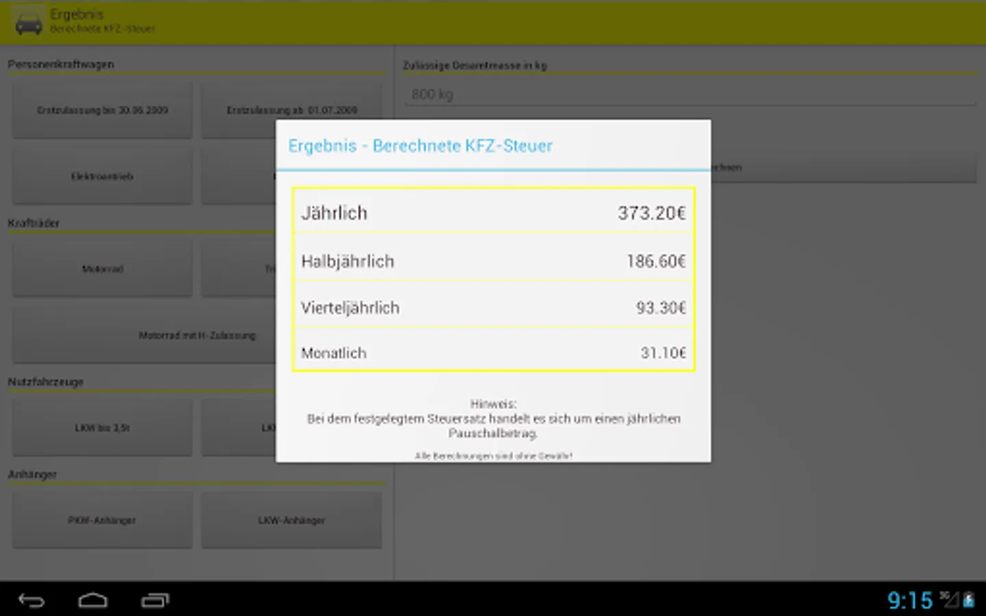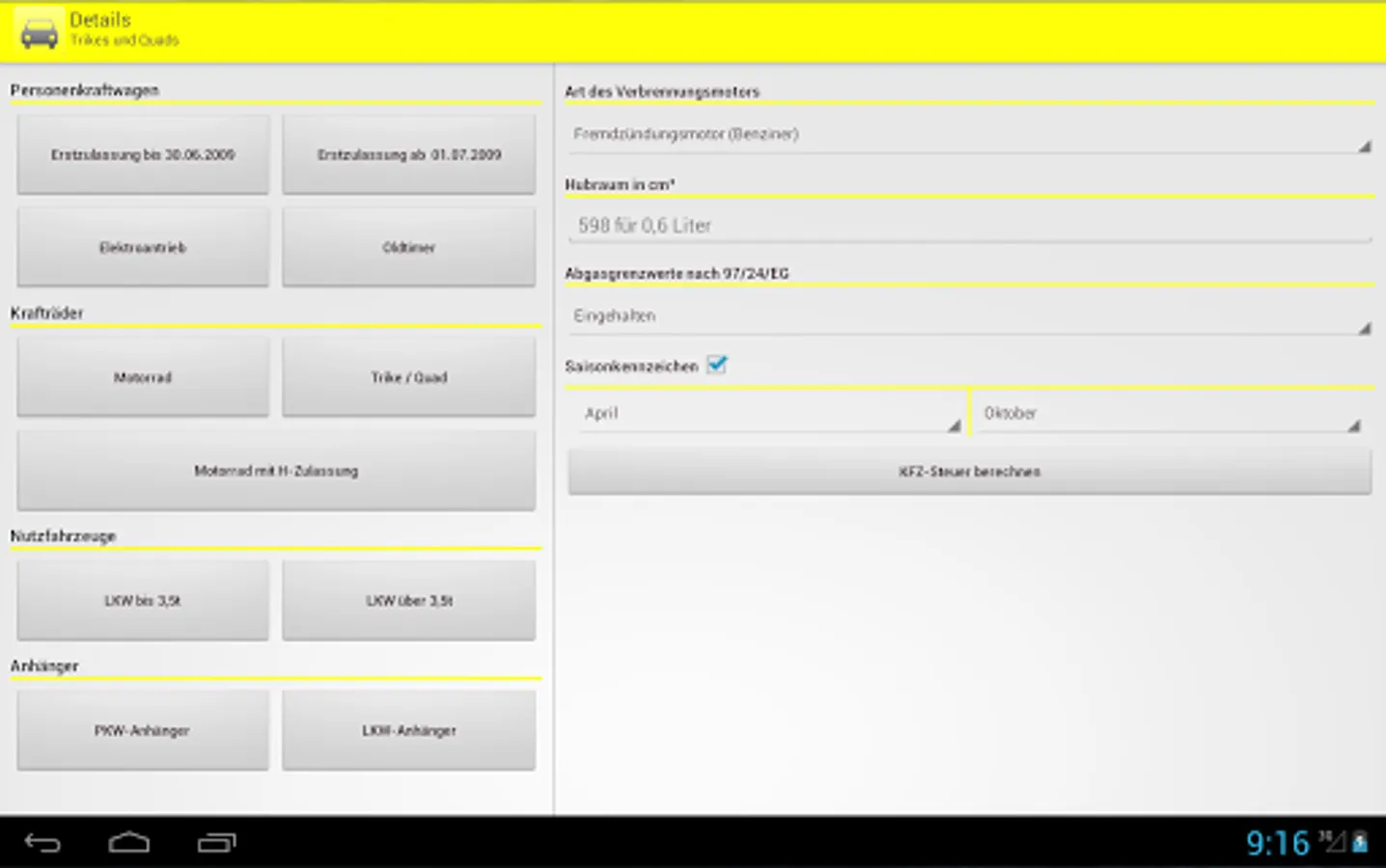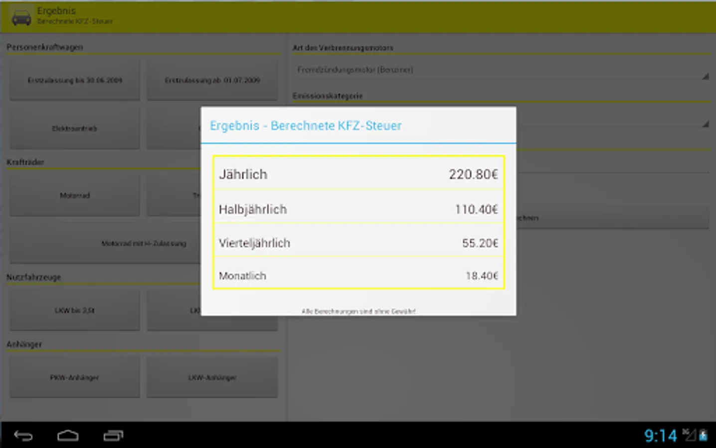 With the Car Tax Calculator Pro you can quickly and easily calculate the annual vehicle tax your vehicle registered in Germany.