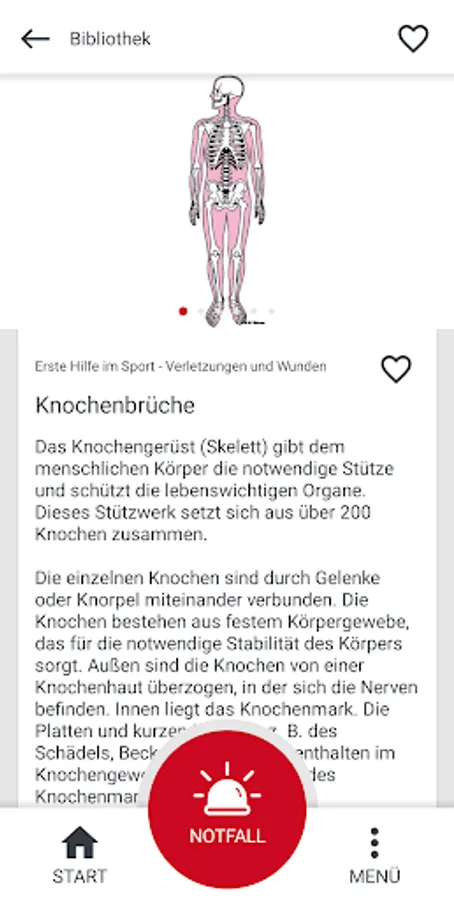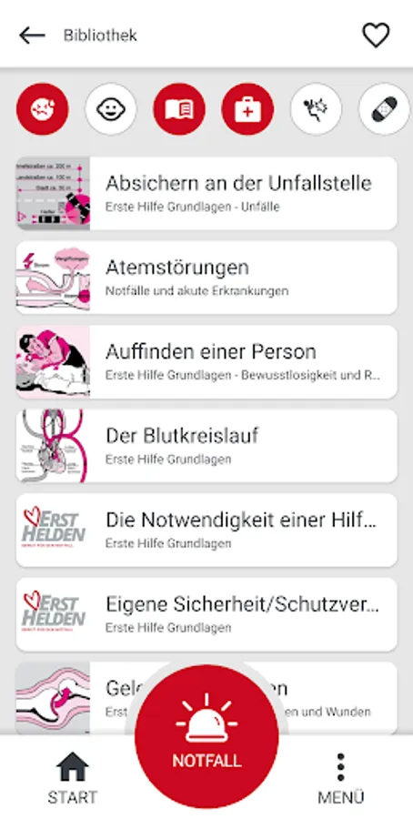 In addition to the AED area, you will find a first aid library in which the most important emergency situations are illustrated and explained. Learn simple things to do and stay tuned to provide first aid when things get serious. Become a first hero too!