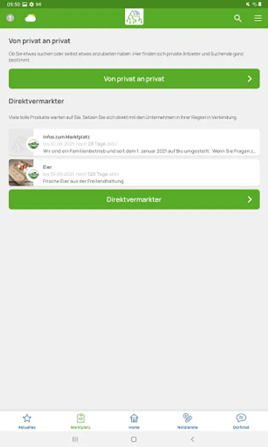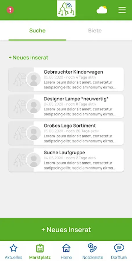 - The marketplace section is the so-called digital “bulletin board”. Here, the village app users can either advertise in search or for offers. If the user is looking for help with shopping, for example, he can place it there.