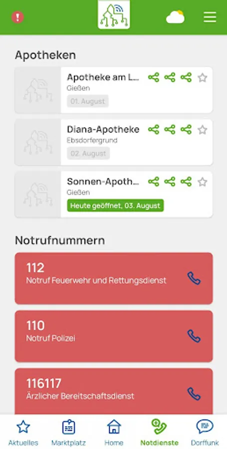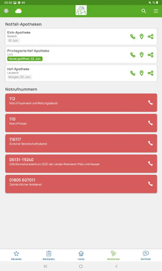 - If you click on emergency services, you will find all emergency pharmacies in the vicinity, which are classified according to the distance from the location. In addition to the emergency pharmacies, users can also find all important emergency numbers and call them directly from the app.