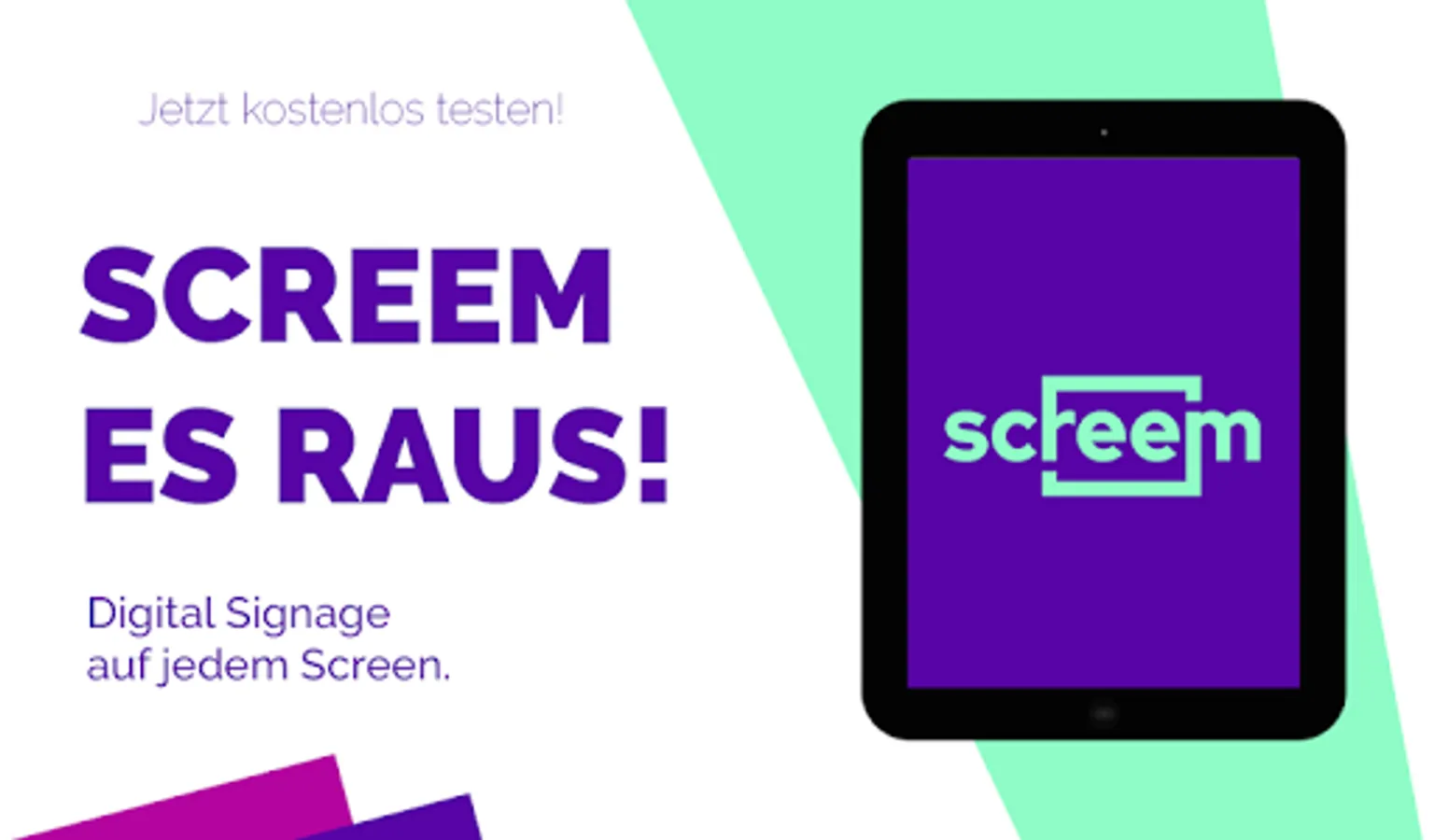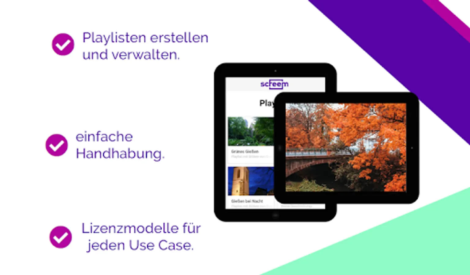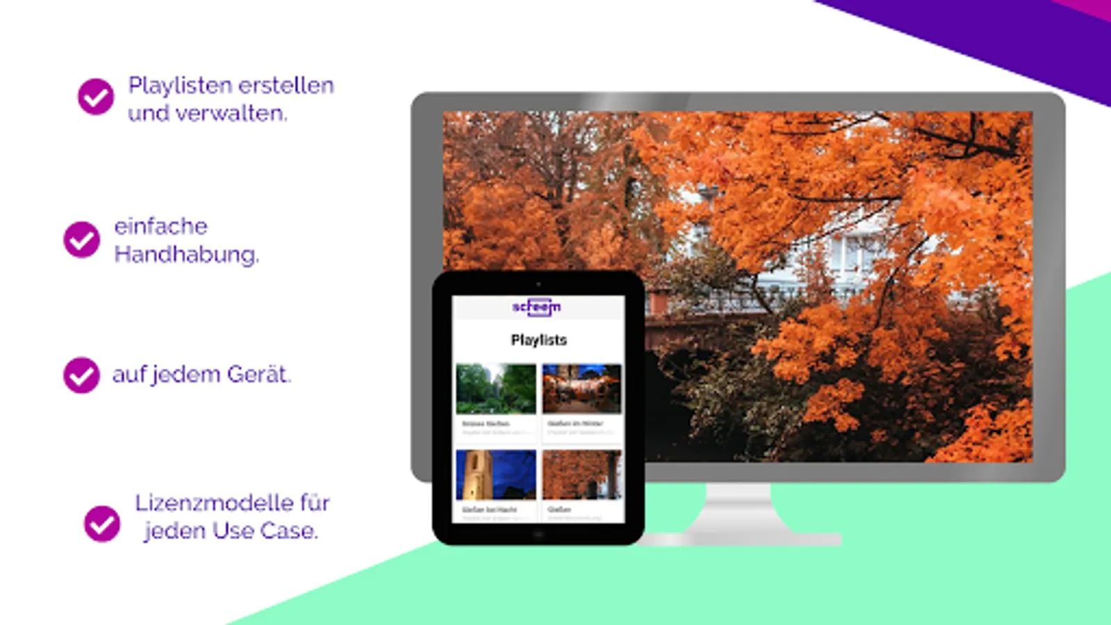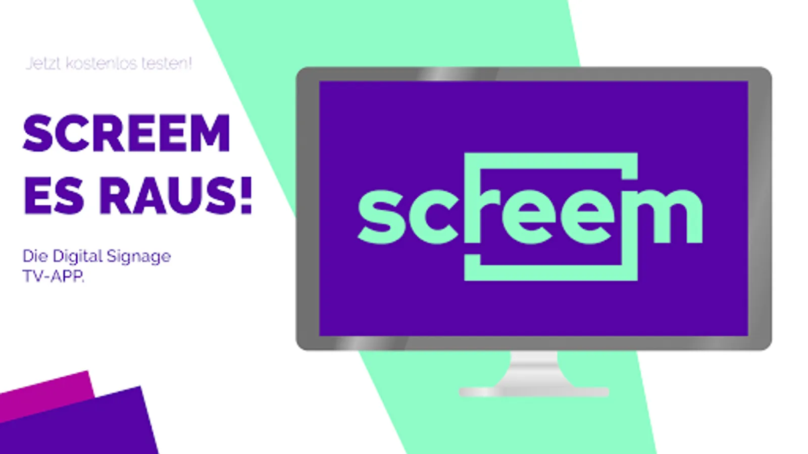 With Screem, you can easily and inexpensively play out advertising, images or videos for specific target groups. An intuitive user interface makes it possible to adapt your content individually and flexibly. Whether photos, videos or PDF documents - simply upload your documents in our management tool and create your own playlist. Would you like to record several screens with individual content? No problem, control several monitors with different configurations centrally. You only need access to Screem and a screen (app-compatible) or alternatively use an Android box for control. For more information: screem.de