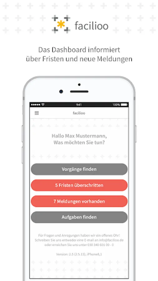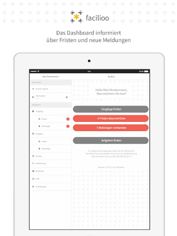 Try facilioo alone without obligation from that brief interactive introduction tour in the app shows you in a very short time the most important functions!