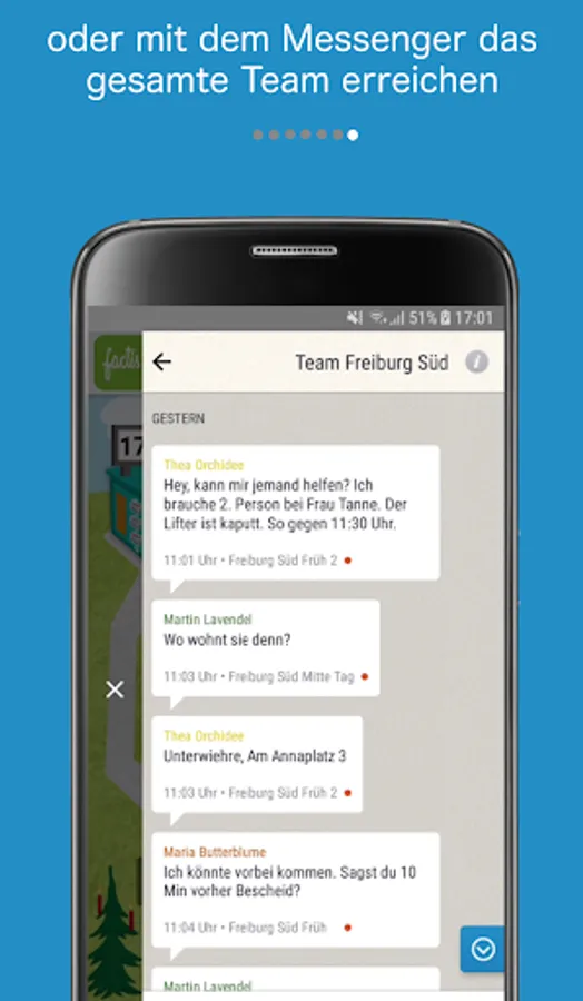 The executives use the factis portal on the PC and all on-the-go working hours, care times, travel and office hours are immediately there. The employees are also networked with each other via Messenger, of course in the safe factis context. For the manager, there is the messenger on the PC, so everyone is immediately informed when there is something new. And quickly a response is written.