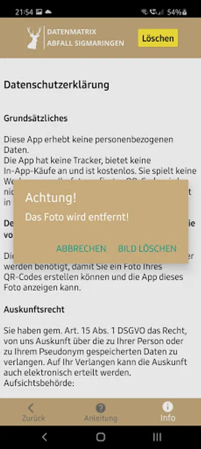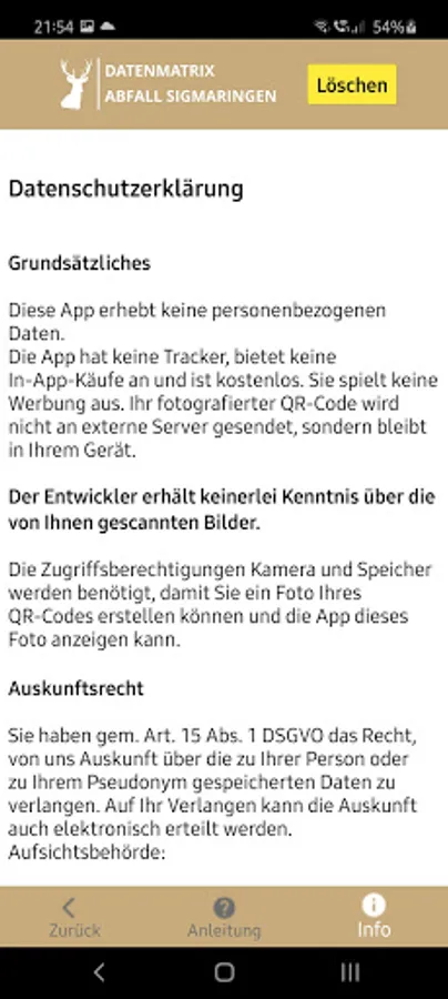 This app does not collect any personal data, does not incorporate any advertising, does not use tracking software and does not transmit any data to the developer. It is of course free of charge, takes up little storage space and is easy on the nerves of both sides of the recycling centers and landfills and possibly also saves money.