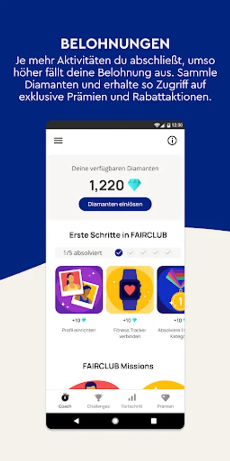 Rewards: The more activities you complete with FAIRCLUB, the more rewards you'll get. Earn diamonds for every activity: walking, jogging, exercising, cycling, learning or meditating. And by completing our missions, you'll receive even more diamonds! The new rewards program makes it easy for you to collect and redeem diamonds & gives you access to exclusive discounts reserved exclusively for FAIRCLUB users.