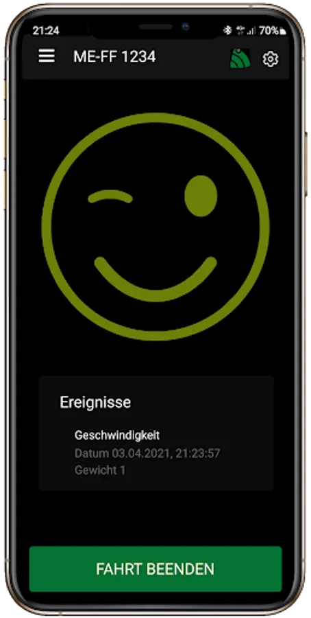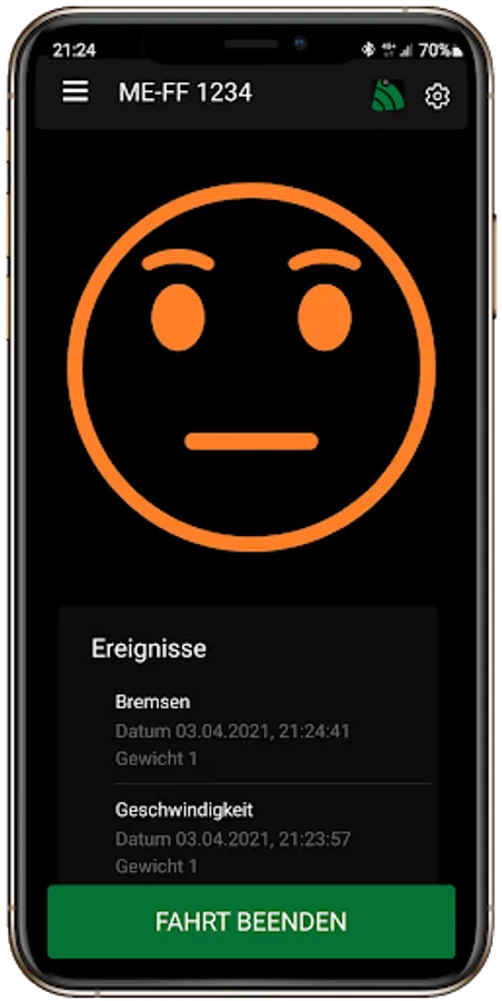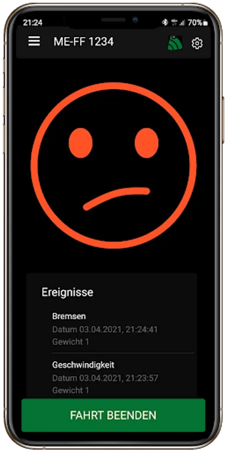 If your driving style changes to aggressive and uneconomical driving behavior, the Fairfleet Eco App will give you feedback in the form of emotional feedback while you are still driving. If you are driving in a relaxed manner, you will be smiled at. If you are under time pressure or in stressful situations and therefore drive more uneconomically and less relaxed, the feedback becomes sadder and you can consciously take countermeasures.