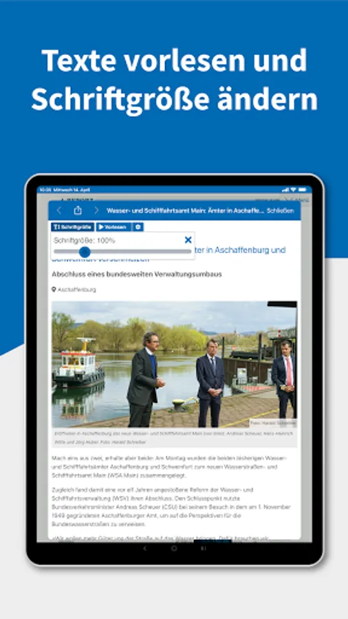 The fresh design and intuitive handling gives you a quick overview of all publications and is now even more fun. In the reading view, you can scroll easily by swiping sideways or zooming continuously into the page. Activate the reading aid to flexibly adjust the font size or have the article read aloud to you.