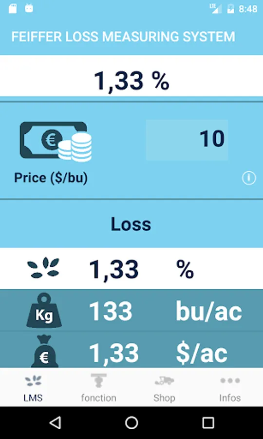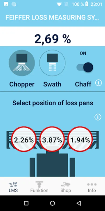 This app serves to calculate grain loss during the cutting and threshing. It helps you to avoid big losses, to calibrate the electronic loss control and to set up your combine harvester optimally. To use this app you need the LMS KIT (Loss Measuring System) from feiffer consult. And this is how it works: one to three loss pans can be fixed to the combine with flexible magnetic holders (possible over the entire working width). The test panels are automatically cast by remote control. Threshing losses are detected. A blower facilitates the separation of grain losses. The grains are weighed by means of a pocket scale.The result is input into the feiffer LMS app. An accurate loss value is calculated on the basis of the specific yield and the combine harvester parameters.