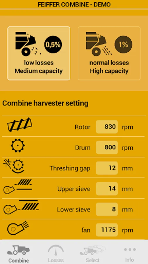 Calibration of combine harvesters made easy - The "feiffer combine" App is an easy step by step guide to the optimum settings of your combine harvester. It can be done quickly and safely because these setting values are field-tested and have proved to be reliable with expert operators. The distinguishing feature of this App is: It adapts the settings also to throughput and losses. In this way, the combine harvester is always set properly not only at all harvest conditions but also within each performance range. Losses are limited.