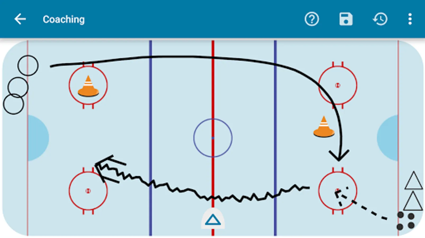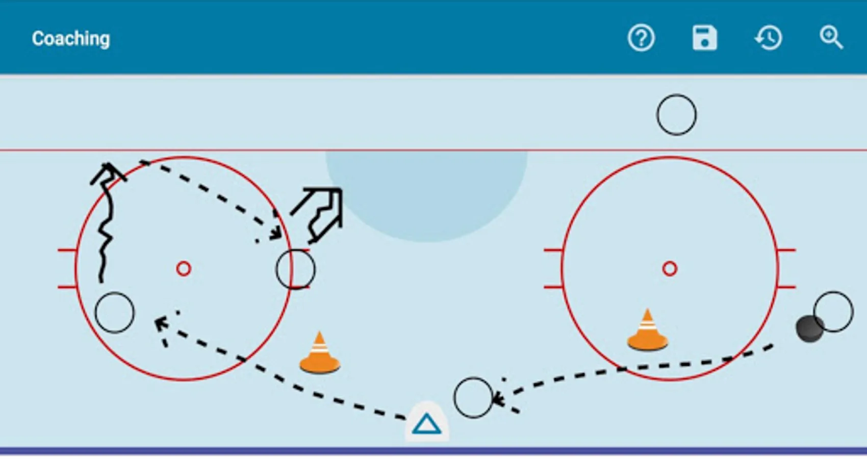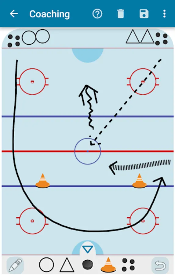 Furthermore this app offers a digital drawing board, which can be used for tactical meetings or to create drills. Created drawings can easily be saved as images and be posted at the locker room. It comes with common symbols, like pylons, pucks or attacking/defending team. In addition to that finger drawn lines can be visualized as different types, such as passing or skating forward with puck.