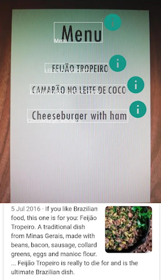 Vacations are awesome, but food ordering is a challenge. Especially when you miss out on great local food, just because you did not know what is hidden behind a menu item. Or think about cocktails or local beer. You now can get those insights immediately shown on your mobile device. The app is translating local food and drinks into meaningful results.