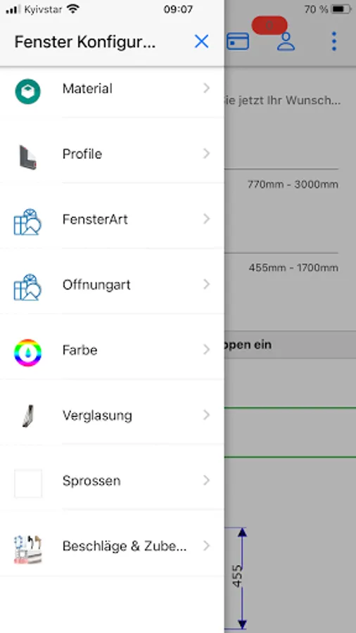 Select the window material you want as step 1: plastic, wood, aluminum, wood-aluminum, or plastic-aluminum window. Also as a separate material for fire protection windows.