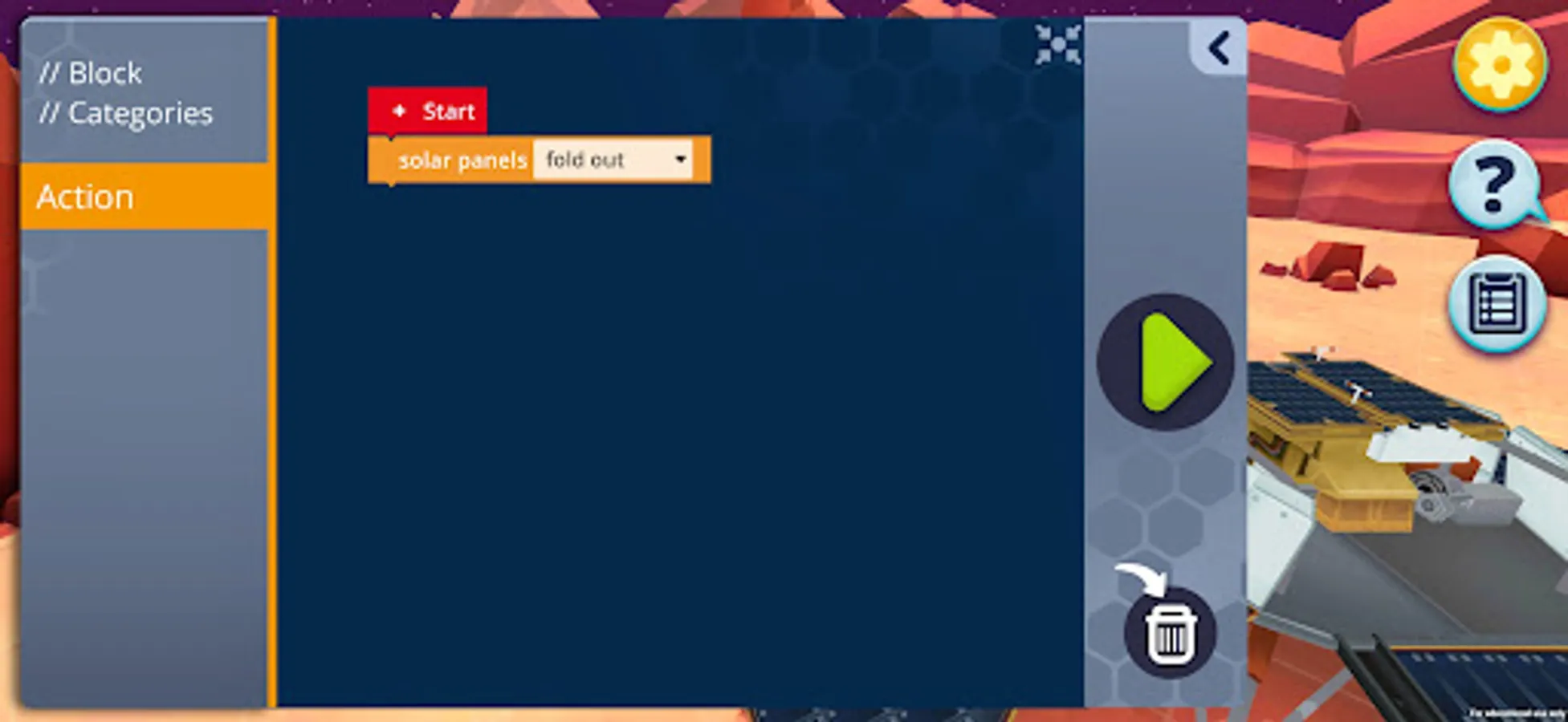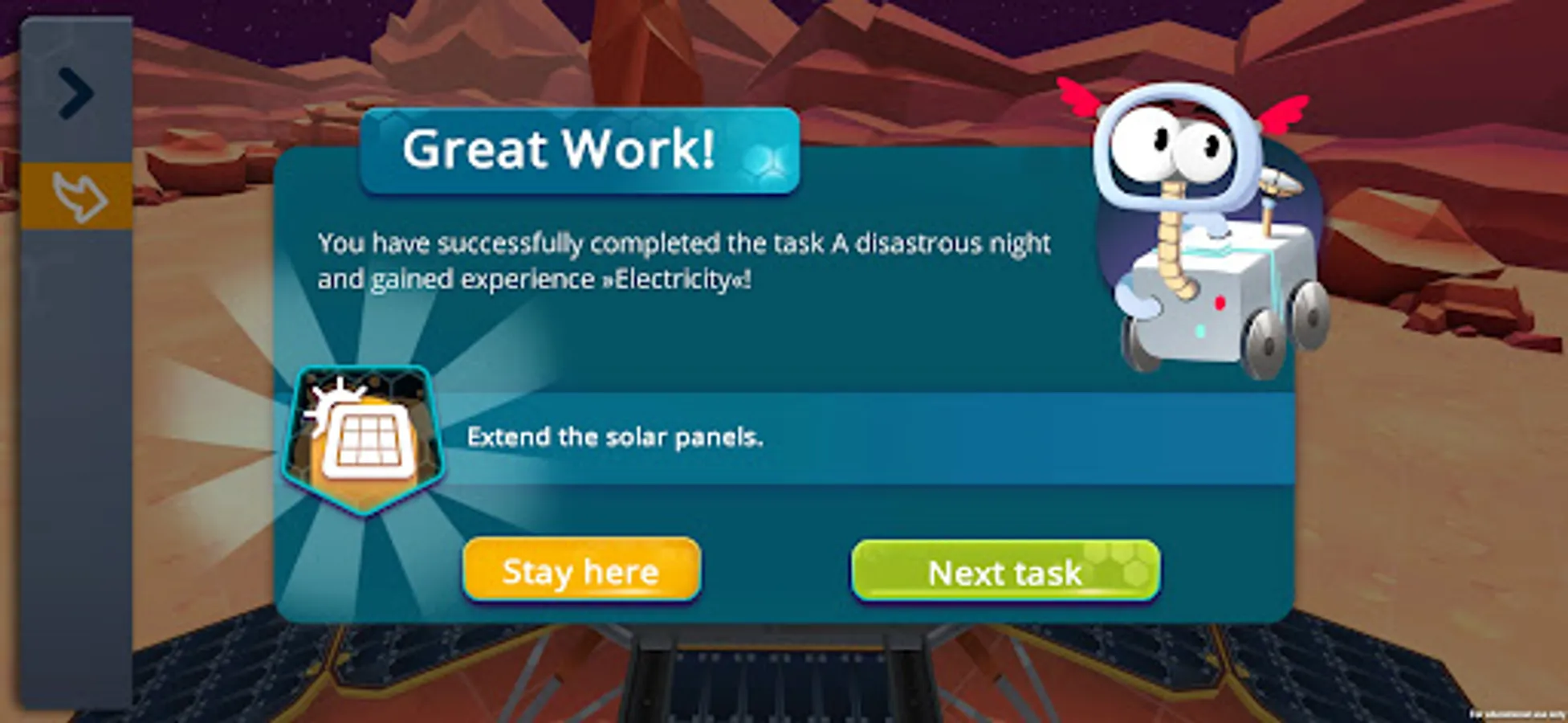 Welcome to the mission »Exploration Mars«! Together with a team of experts you sent the rover Rosa to Mars. Rosa has landed safely, and now it's your job to program and send her on an exploration tour. In 17 exciting levels, you'll set out to find traces of water and biological life on Mars.