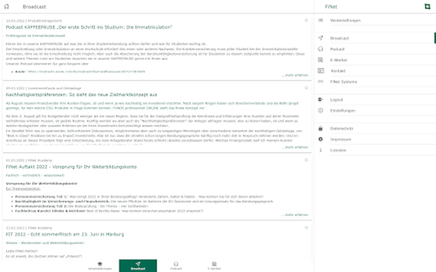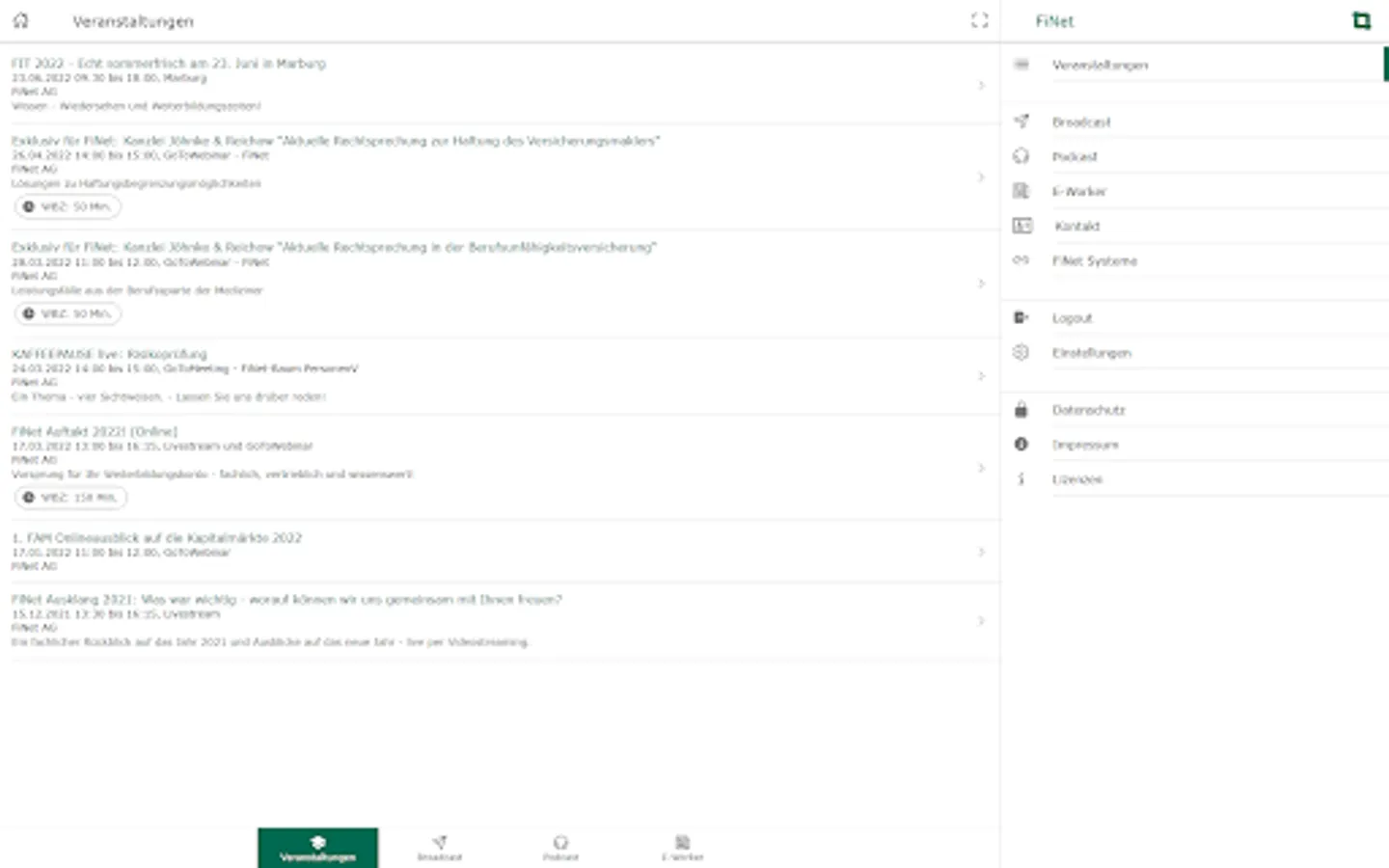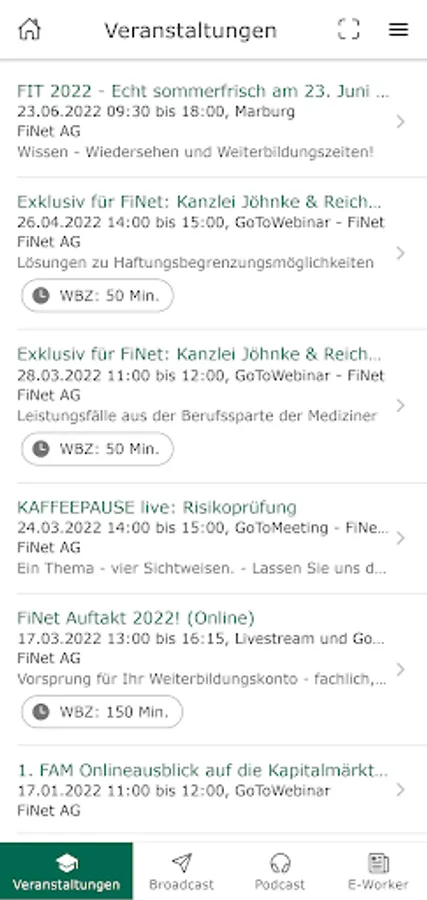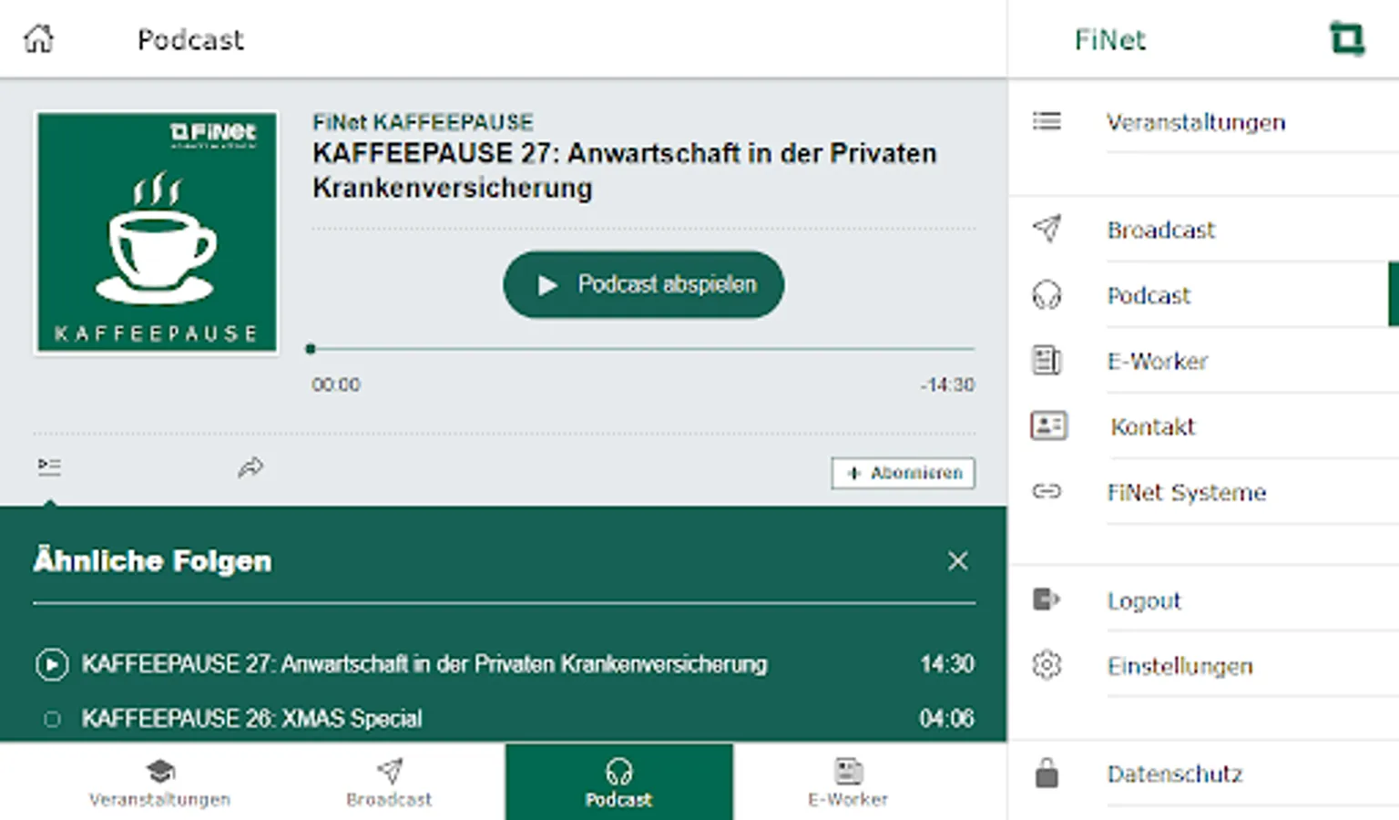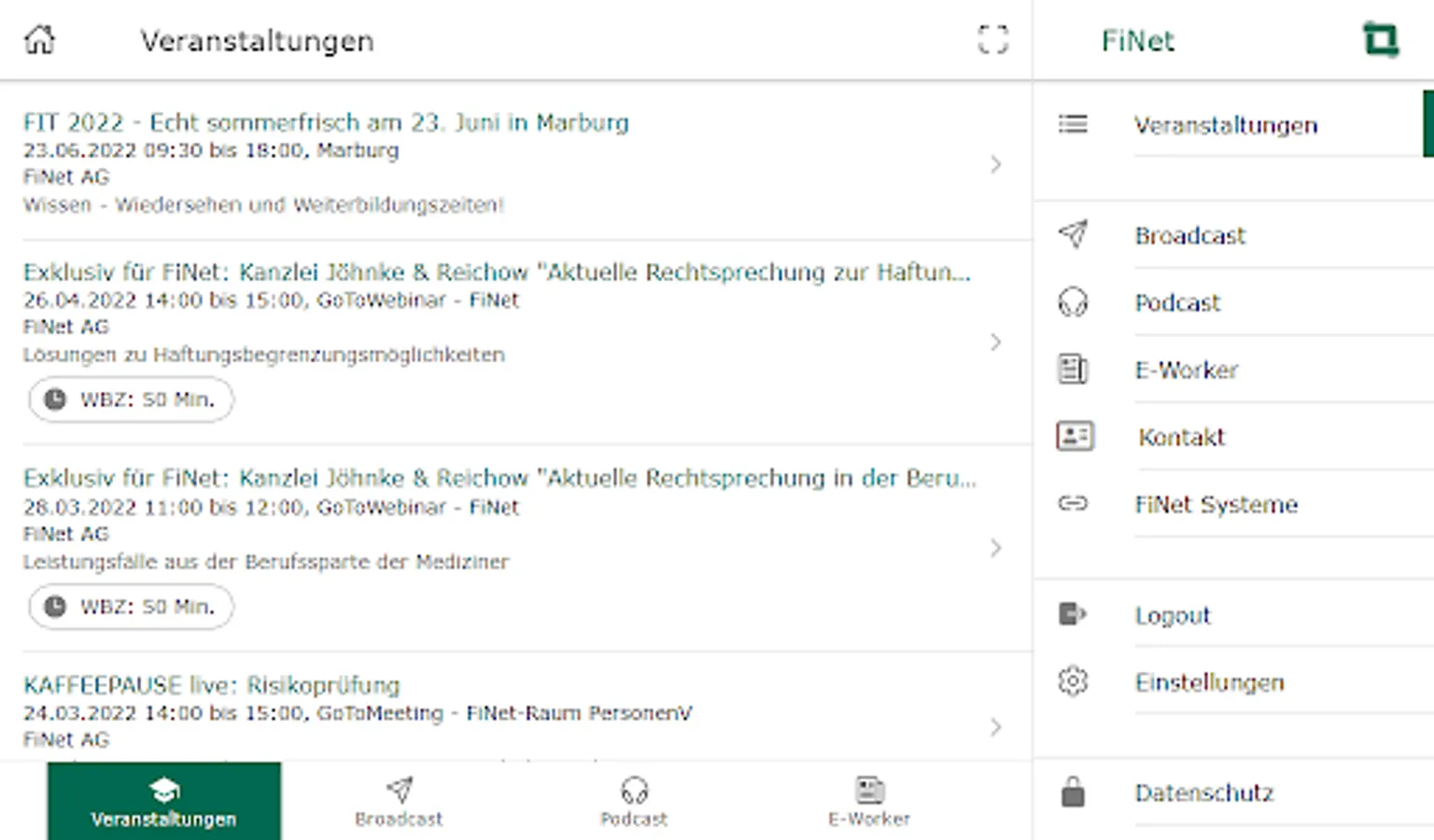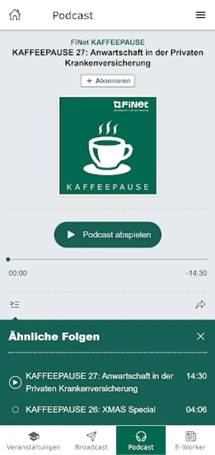 With the FiNet app, you always have the services of the FiNet Group at hand: book events directly, call up our podcast "COFFEE BREAK" in the app, read the e-paper FiNet E-Worker and use the broadcast function to miss out never our most important news.