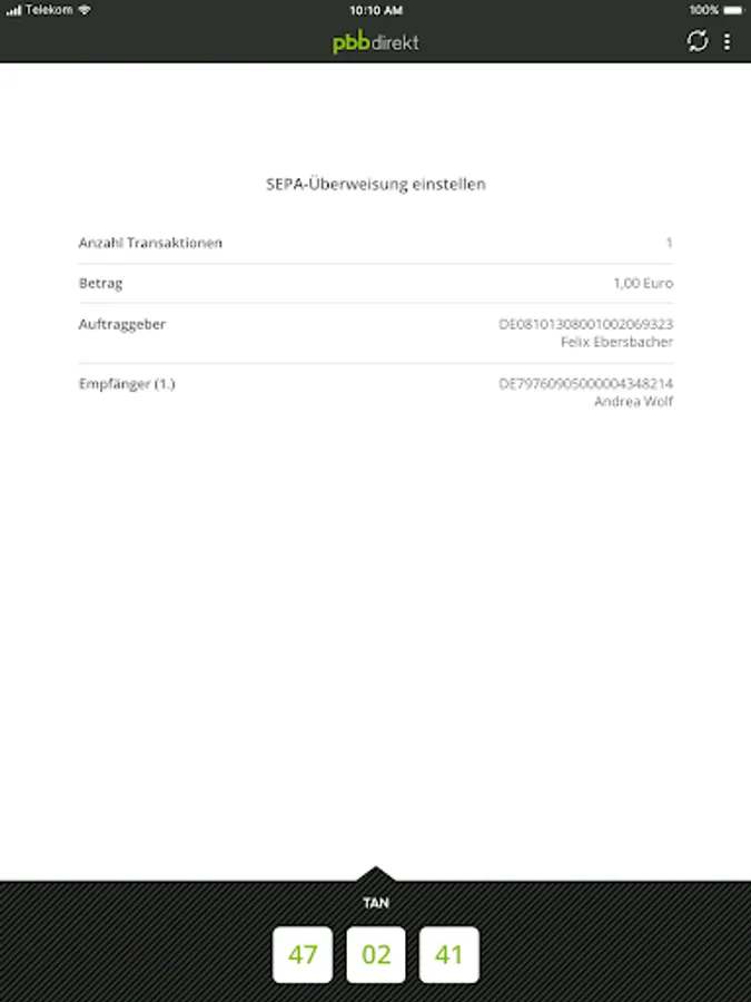 You will receive your TAN anytime, anywhere in the password-protected pbb directly push TAN app on your device; with indication of the essential order data. Available for all TAN-duty operations such as transfers, cash deposits, requests or changes to your contact details.