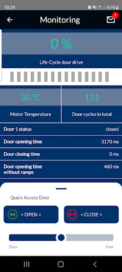 The monitoring function makes a number of data available to the user, such as number of cycles of the door drive, motor temperature, life-cycle display of the door drive, controller type and firmware version, motor type and firmware version, warnings, etc.