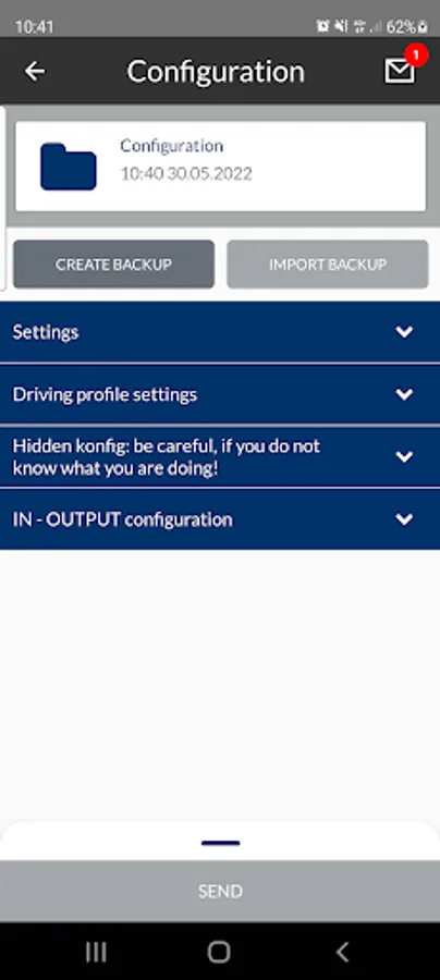 The app can also be used to configure settings. The data from the controller are retrieved, modified via the app and sent back to the controller afterwards. In order to create an external backup of specific settings, the configuration files can be sent via email and read again, if necessary.