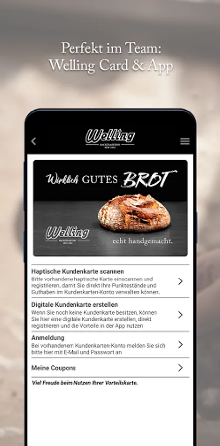 In conjunction with the Welling Card, the result is a perfectly coordinated team: Simply scan the QR code on the back of the Welling Card in the app, link it to your customer account and you can see your credit or your coffee points.