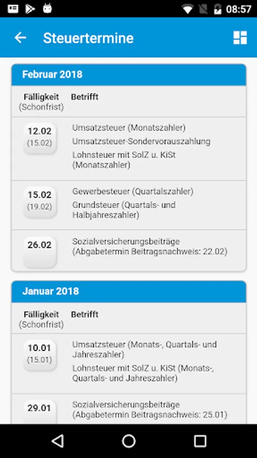 You want to know, when that tax payment dates? Whether, for example, Income tax or sales tax deduction, income tax or business tax - in the app you can find the corresponding dates.