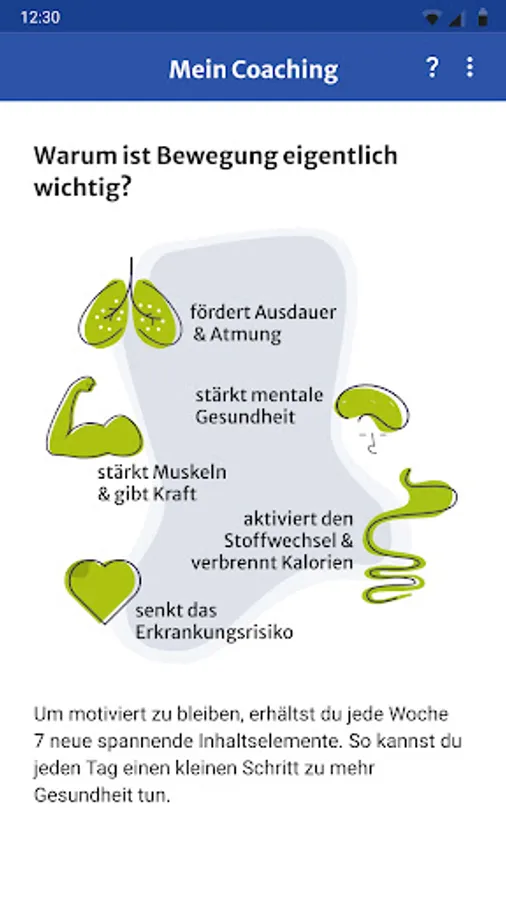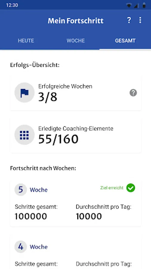 With the mobile phone, the steps are automatically counted via secure interfaces and displayed on the start page. Each participant receives an individual daily and weekly step goal, which should be achieved over a period of 8 weeks. Individual progress can be tracked in the ranking. In addition, the participants receive new coaching content every week - consisting of psychological and sports science content, workouts, relaxation audios as well as tips and challenges for integrating more exercise into their everyday lives. At the end of the coaching, the users receive a certificate of participation.